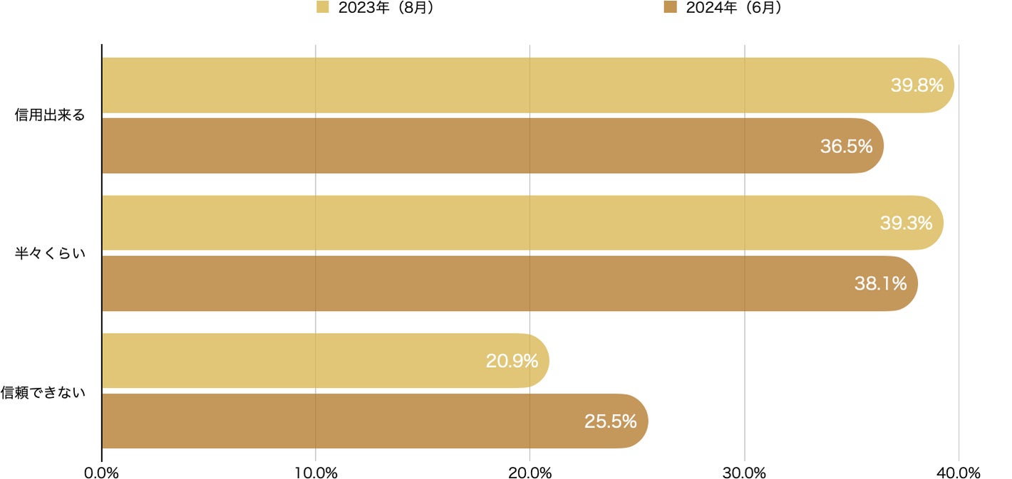 調査対象メディア全体における信頼度の回答を見ると、「信頼出来る」「半々くらい」は合わせると74.6%(2023年 : 79.1%)、「信頼出来ない」が25.5%(2023年 : 20.9%)という結果となり、大多数の利用者がオンラインメディアに対して一定の信頼を持って利用していることがわかります。一方、昨年比では信頼性がやや低下する結果となりました。