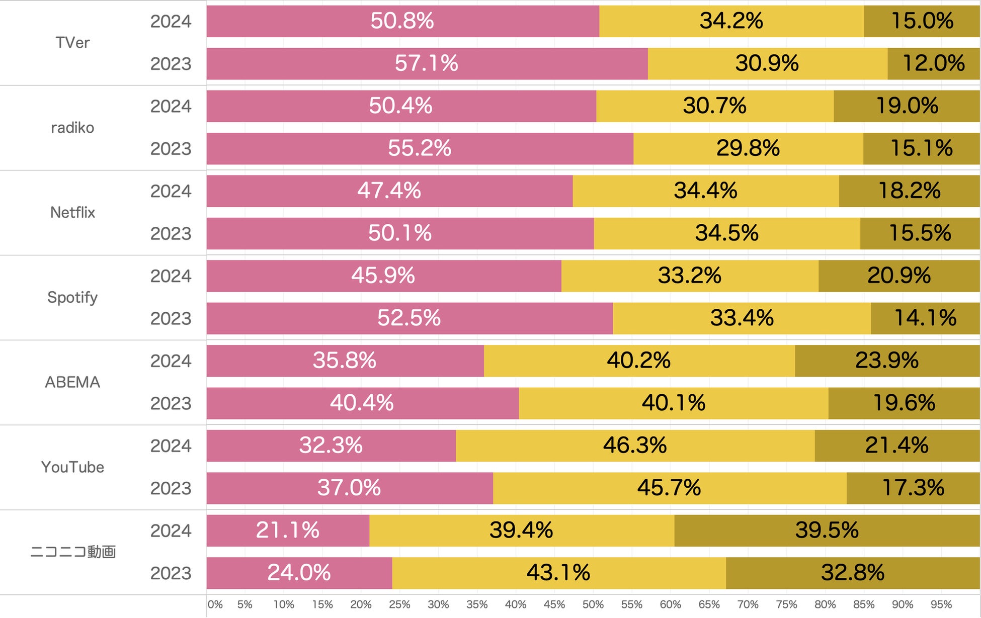 昨年から傾向は変わらず「TVer」および「Radiko」といった民放系メディアへの信頼性が高い傾向にあります。これらのメディア利用者の半数以上が「信頼出来る」と答えています。昨年同様、「Netflix」と「Spotify」がそれに続く結果となっています。