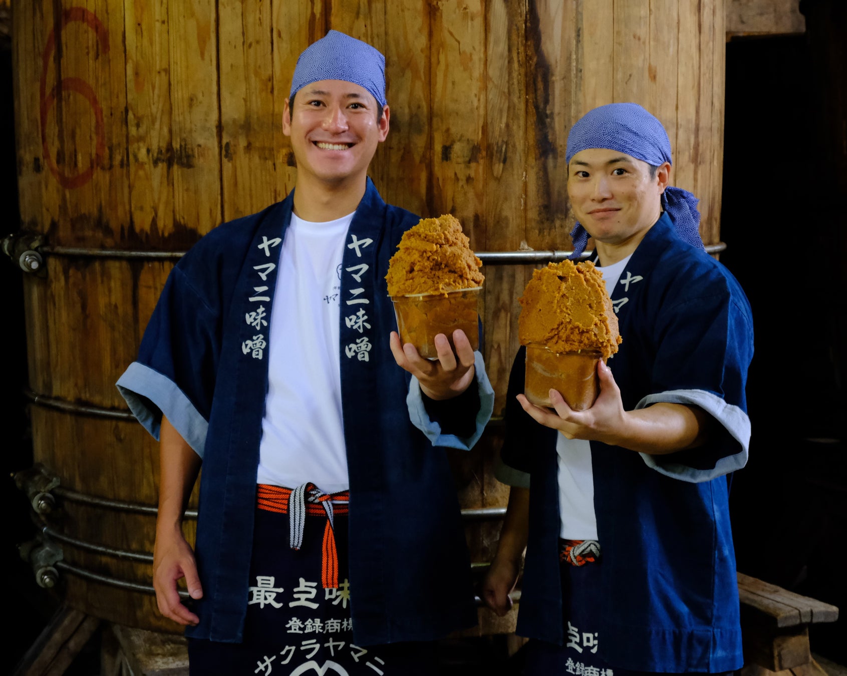 当社は創業以来137年もの間、味噌から味噌へ発酵する菌をつなぎ生命を絶やすことない伝統製法で味噌造りを行う、国内でも数少ない木桶造りの味噌蔵です。