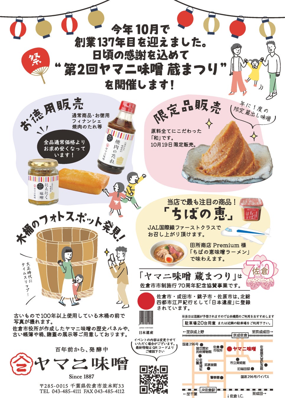 10月19日(土)に、第2回ヤマニ味噌蔵まつりを開催、今年は、「佐倉市市制70周年記念協賛事業」として実施致します。年に1度の蔵開き、ぜひお越し下さい!