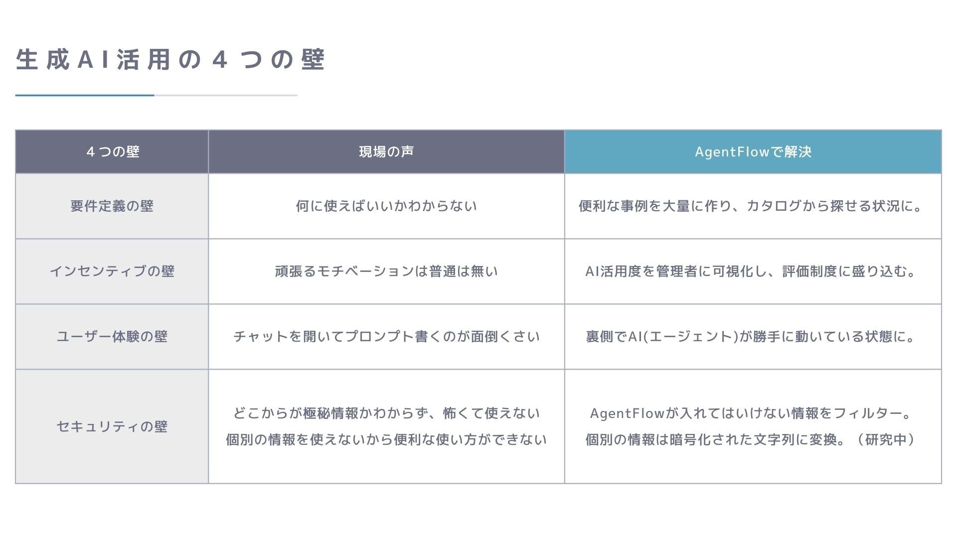 法人の生成AI活用の4つの壁を取り除く。AI連携プラットフォームAgentFlowをローンチ。