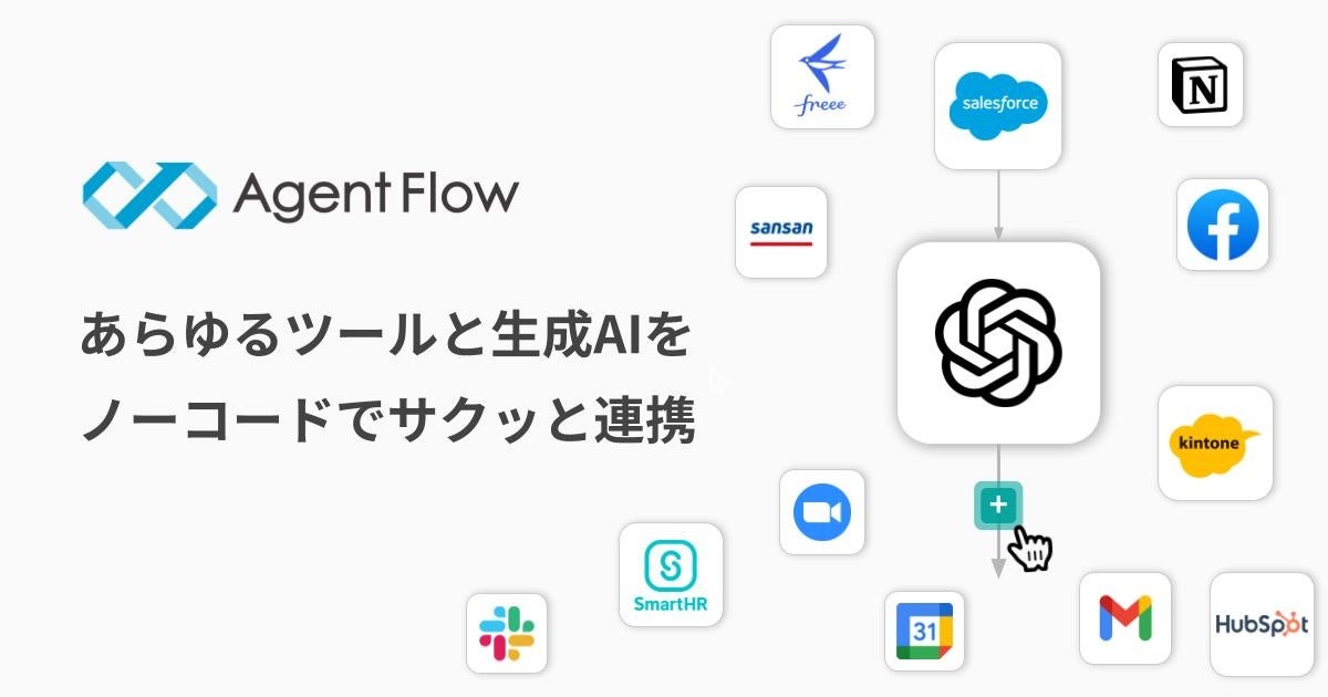 株式会社パンと水と(本社:東京都豊島区、代表取締役:平岡拓、以下当社)は、法人様の生成AI活用を推進すべく、ChatGPTなどの生成AIと、SalesforceやGmailなどの普段ご利用のツールをノーコードで簡単に連携できる "AgentFlow" (https://agent-flow.ai ) をリリースしました。