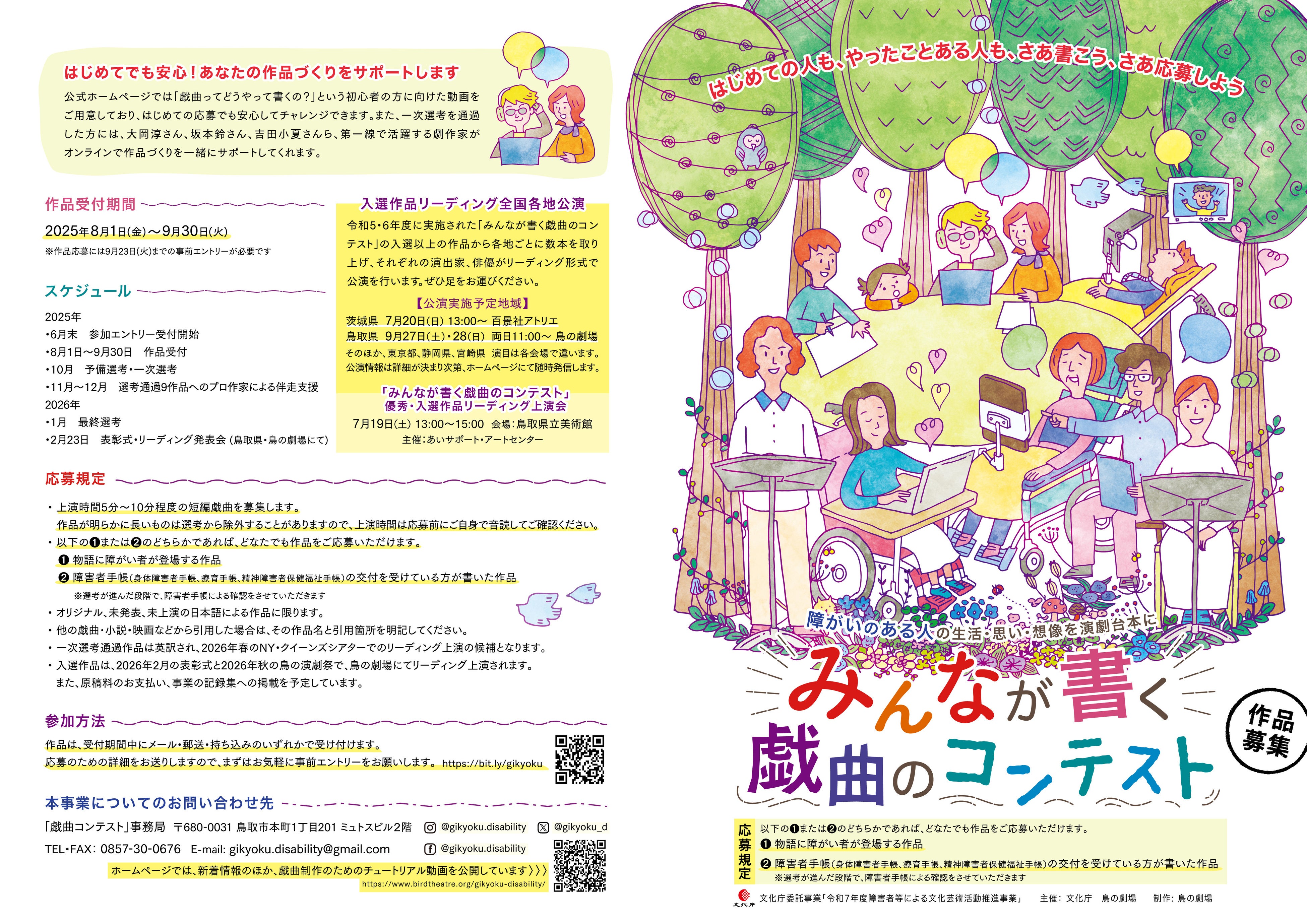 コンテストは、8月1日から9月30日まで作品を受け付け、入選作品は2026年春にアメリカ・クイーンズシアターでの上演候補になるほか、同年2月の表彰式、同年秋の鳥取・鳥の演劇祭でのリーディング上演を予定しています。