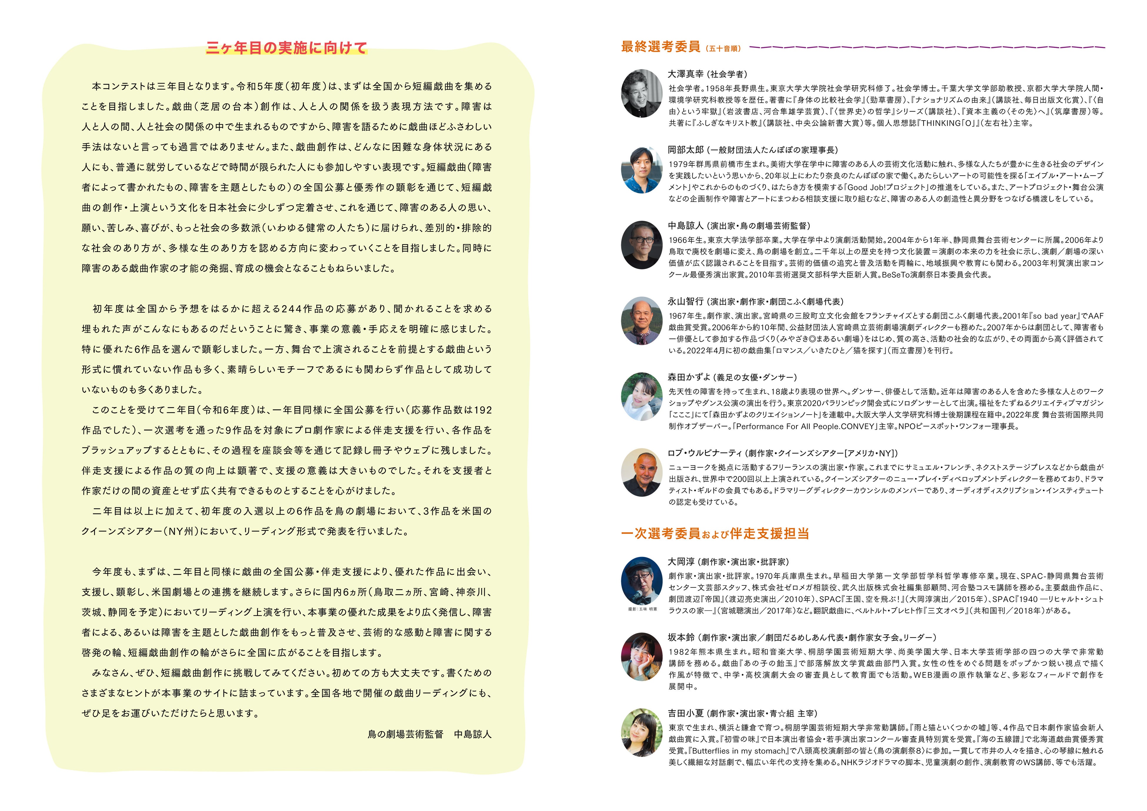 "クイーンズシアターによる障がいのあるアーティストと観客のための取り組み、シアターフォーオールの中で最も成功した事業のひとつが、障がいのある劇作家による、もしくは障がいのある登場人物がいる短編戯曲のプログラムです。鳥の劇場がこのモデルを活用してくれることを嬉しく思います。"