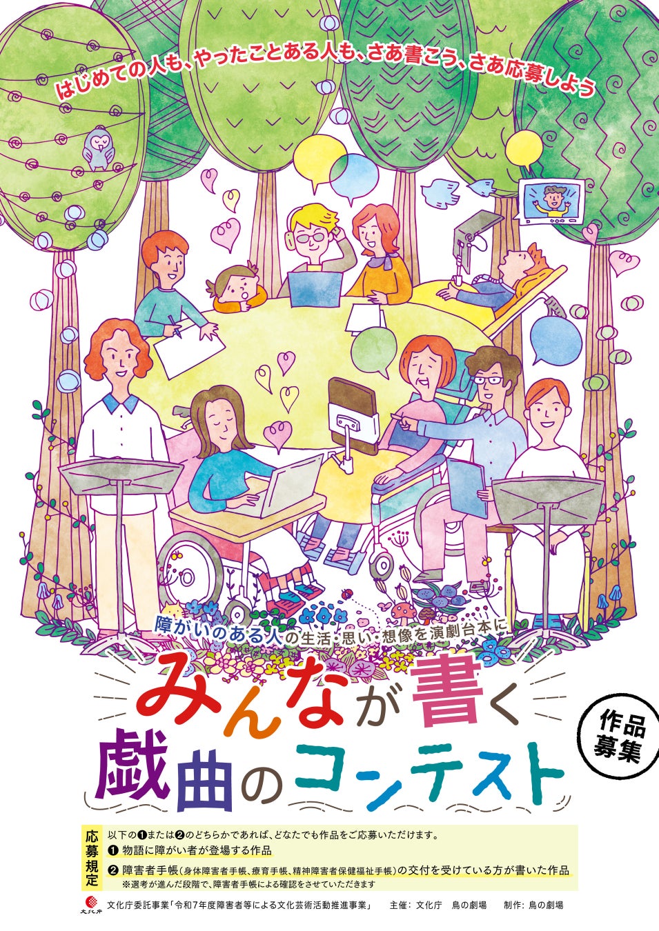 鳥取県・鳥の劇場は2025年、「みんなが書く戯曲のコンテスト 〜障がいのある人の生活・思い・想像を演劇台本に」を開催します。「障がい」をテーマに誰もが参加できる、短編戯曲のコンテストです。