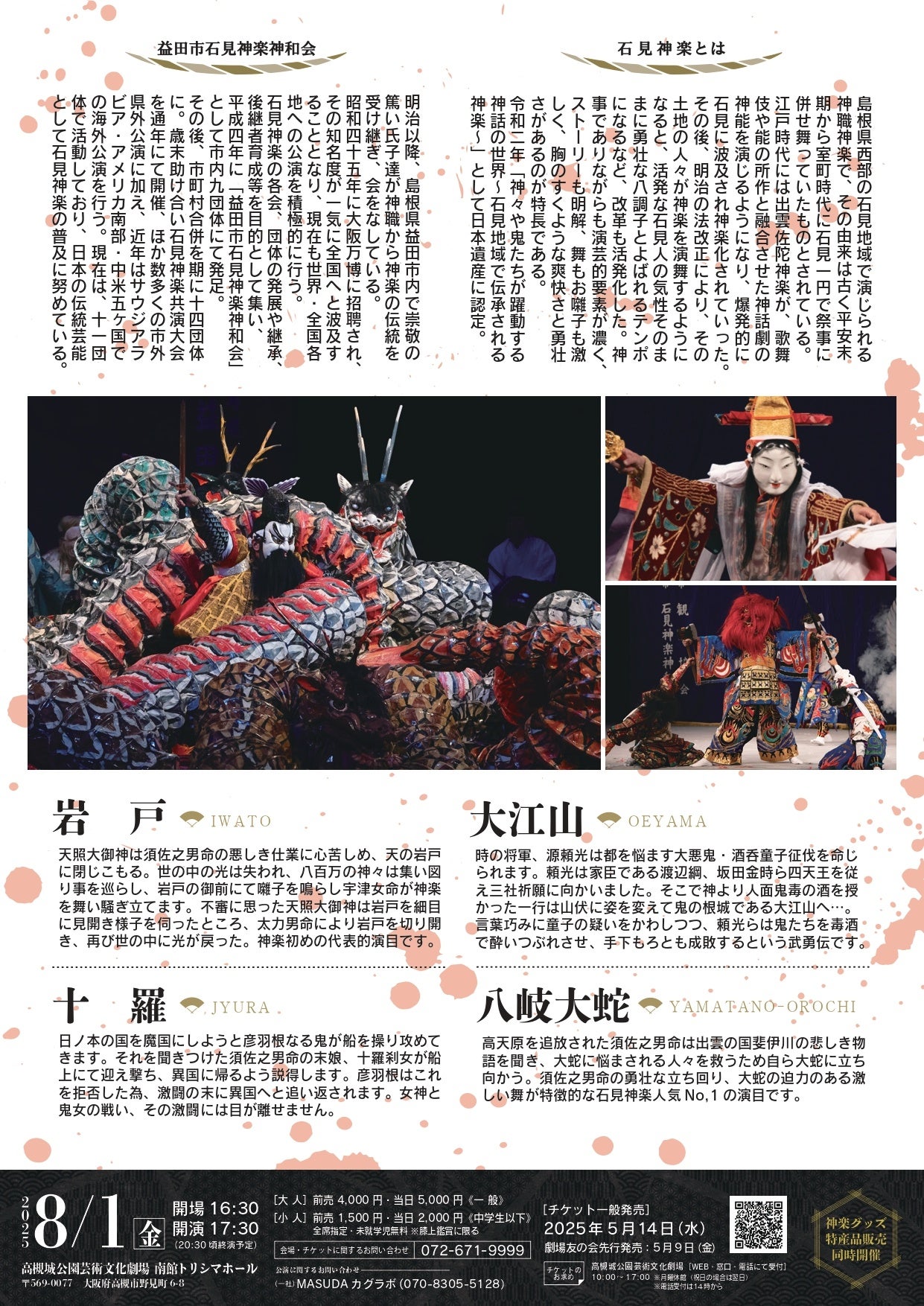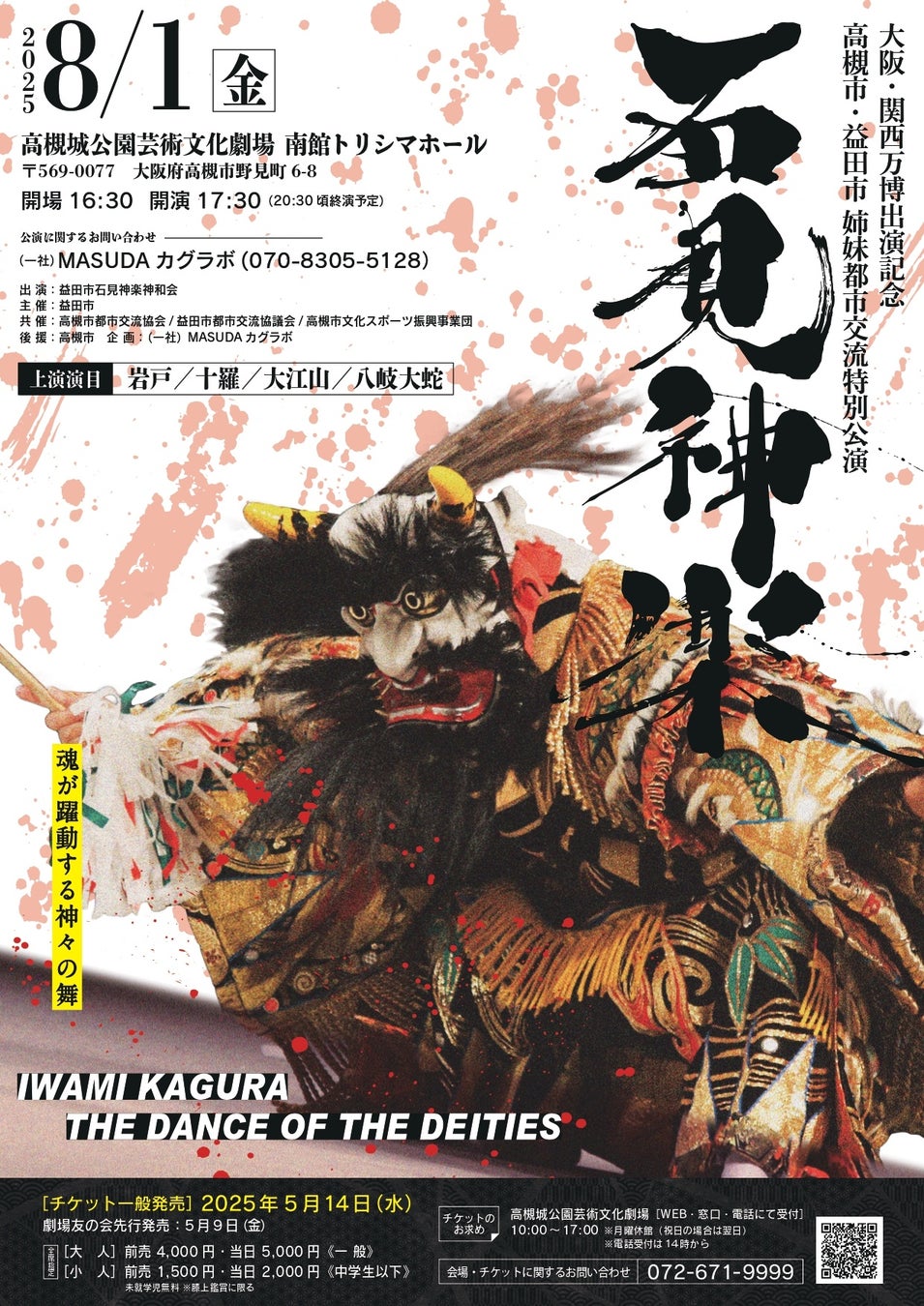 一般社団法人MASUDAカグラボ(所在地:島根県益田市、代表:神田 惟佑)は、「石見神楽特別公演」を2025年8月1日(金)に上演いたします。島根県の誇る石見神楽は、日本遺産の登録を受けた日本を代表する郷土の伝統芸能です。石見神楽は神事でありながらも演芸的要素が濃く、ストーリーも明快、舞もお囃子も激しく、胸のすくような爽快さと勇壮さがあるのが特長です。本公演では高槻市の姉妹都市である島根県益田市より、精鋭メンバーが出演。公演当日は益田市の特産品販売も同時開催されます。