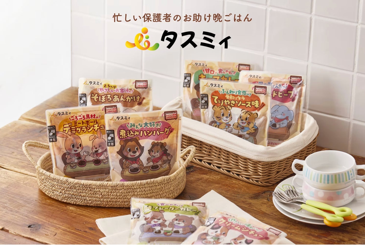 『タスミィ』は、保育施設で必要な分だけ夕食のおかずを購入できるハウス食品グループのレトルト惣菜ブランドです。忙しい日の保育園お迎えついでに夕飯のおかずを持ち帰ることができ、帰宅後すぐに親子で温かい食卓を囲めるよう開発されました。サービス名の「タスミィ」には“+me(私を足して)”という意味が込められており、「頑張るお父さん・お母さんの助けになりたい」という想いが詰まっています。