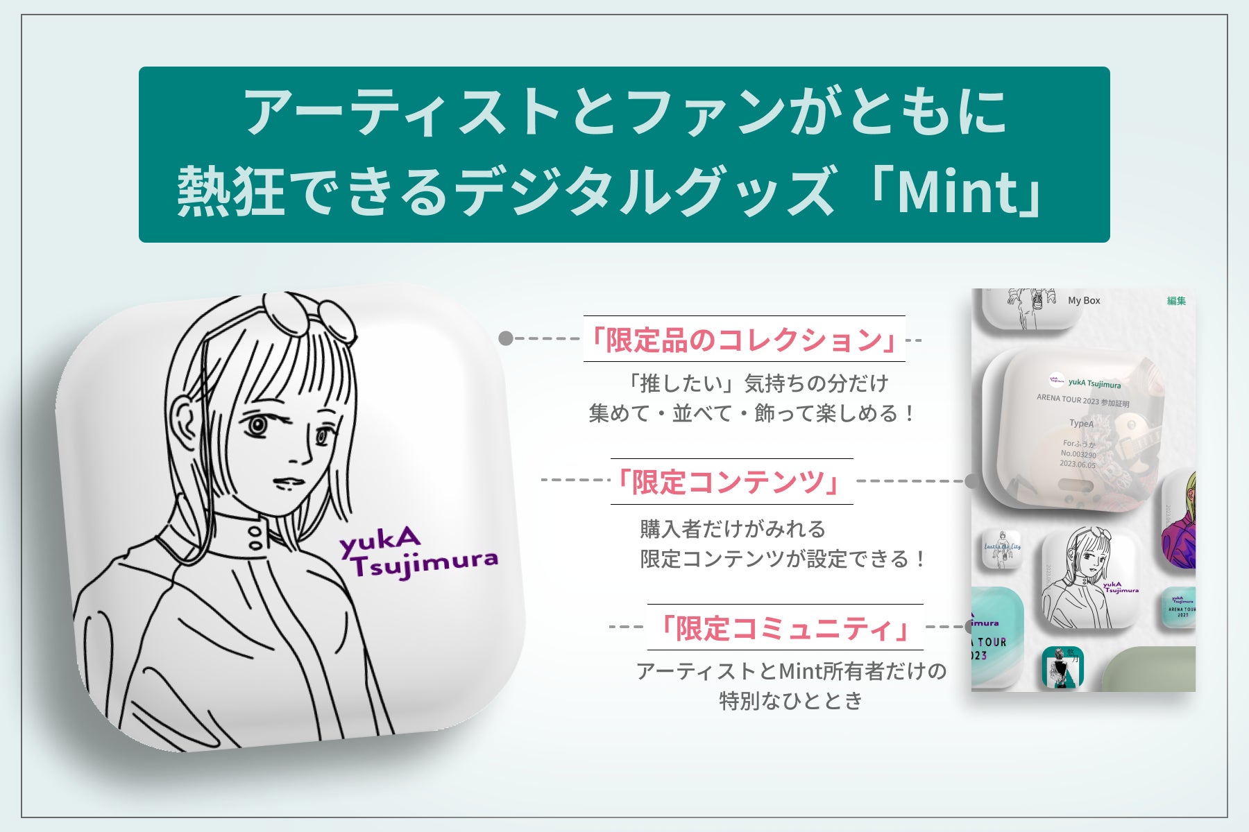 クリエイターやイベンターが、記念日やイベント等を記念して期間限定で販売するデジタルグッズ「Mint」を、ファン向けに提供できるプラットフォーム。「Mintice」を通じて、イベントや記念日の盛り上がりの総量を増やすことを目指します。