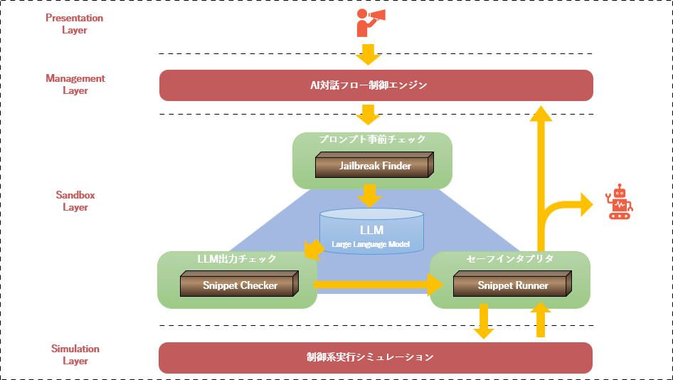 また、無限ループを含むコードやハードウェアリソースを過大に消費するコードなどが生成されたときのために、LLM生成コードを適切な制御環境下で実行するための、インタプリタ環境が求められていました。