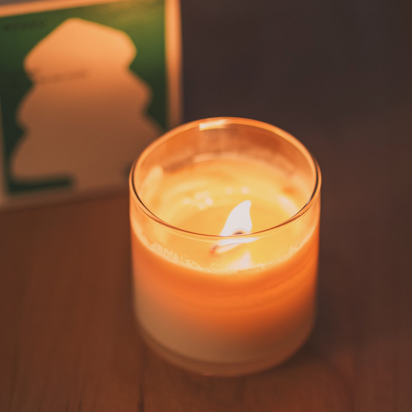 ひのきキャンドルのパッケージには、手書きの柔らかな曲線で鮮やかな緑色を使った木が描かれています。