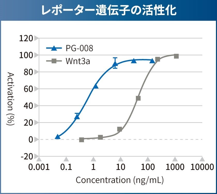 PG-008と市販されているリコンビナントWnt3aの機能比較試験を行いました。具体的には、HEK293細胞におけるTCF-LEFレポーターアッセイ(ルシフェラーゼ遺伝子の活性化で評価)を用いて、PG-008とリコンビナントのβ-カテニン経路に対するアゴニスト活性を比較しました。その結果、PG-008はより低濃度で強いレポーター遺伝子を活性化させ、Wnt3aよりも優れたアゴニスト活性を持つことが示されました。