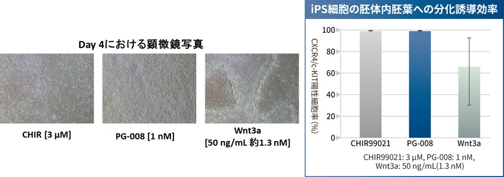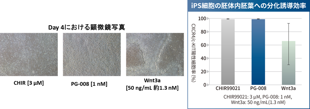 その結果、リコンビナントWnt3a(50 ng/mL, 約1.3 nM)を使用した場合、Day4においても未分化の細胞が多く見られ(下図左)、DEの分化誘導効率はおよそ60%でした(下図右)。一方、PG-008およびCHIRを使用した場合、DEへの一様な分化が見られ(下図左)、98%以上の分化誘導効率が得られました(下図右)。この結果より、PG-008は1 nMの低濃度でCHIRを3 µMの濃度で使用した場合と同等の分化誘導効率を発揮することが示されました。さらに、PG-008は10 µMの高濃度でも細胞毒性を示さないことも確認しております。なお、本実験は、イギリス・Nottingham大学のDr. Nick Hannan氏によって行われました。