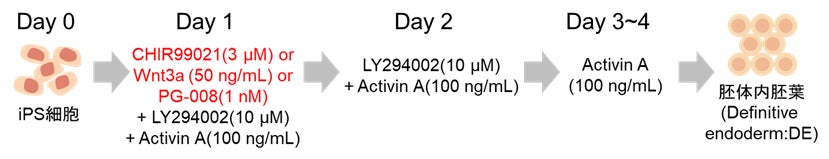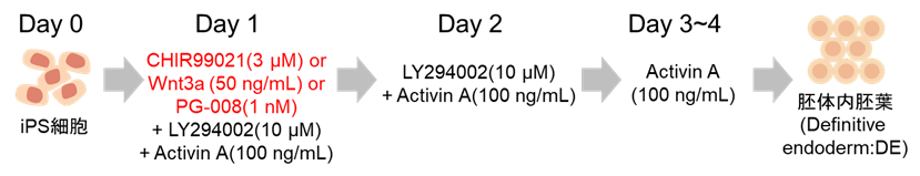 iPS細胞から胚体内胚葉(Definitive Endoderm: DE)への分化誘導において、PG-008、低分子化合物CHIR99021 (以下、CHIR)、リコンビナントWnt3aのそれぞれを用いた場合における分化誘導効率を以下のスキームによって比較しました。なお、CHIRはWnt3aの代替として広く用いられているGSK-3β阻害剤です。