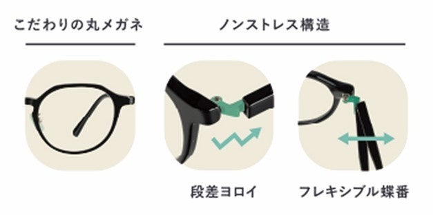 2023年6月に発売した第1弾「ボストン型」は、個性的になりやすく難易度が高い丸メガネを、角の要素を取り入れマイルドな印象に中和することでどなたにでも似合うデザインにしており、発売以来、好評をいただいております。
