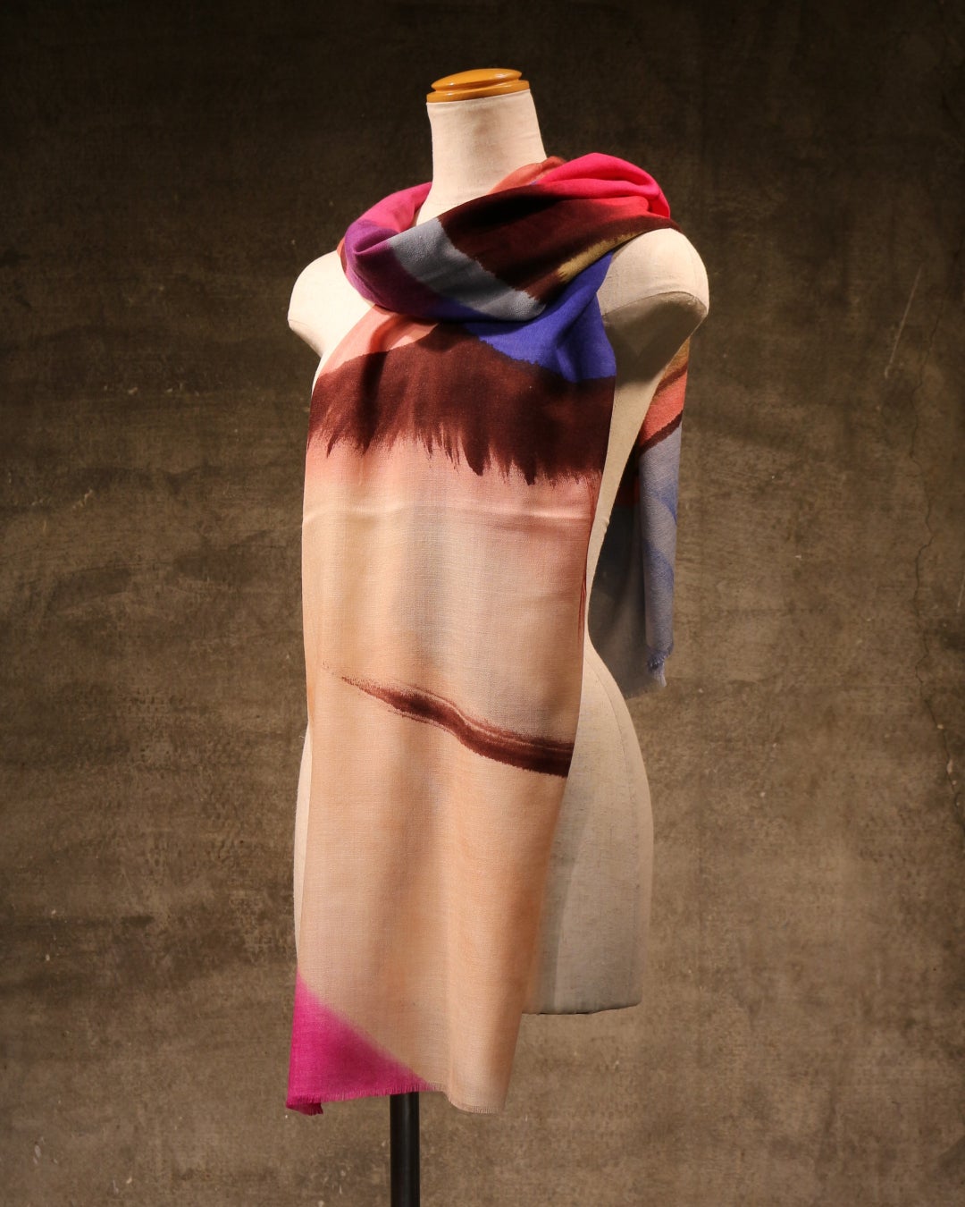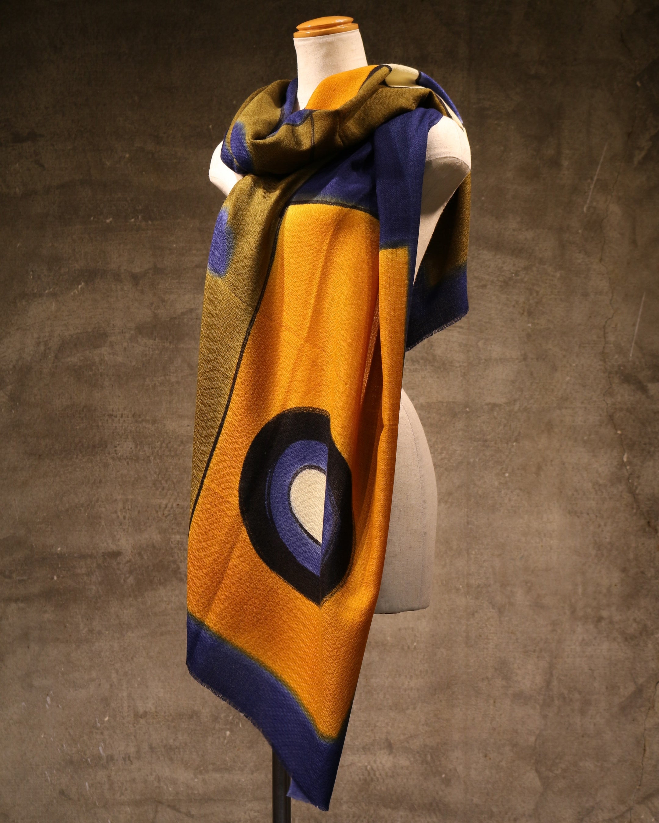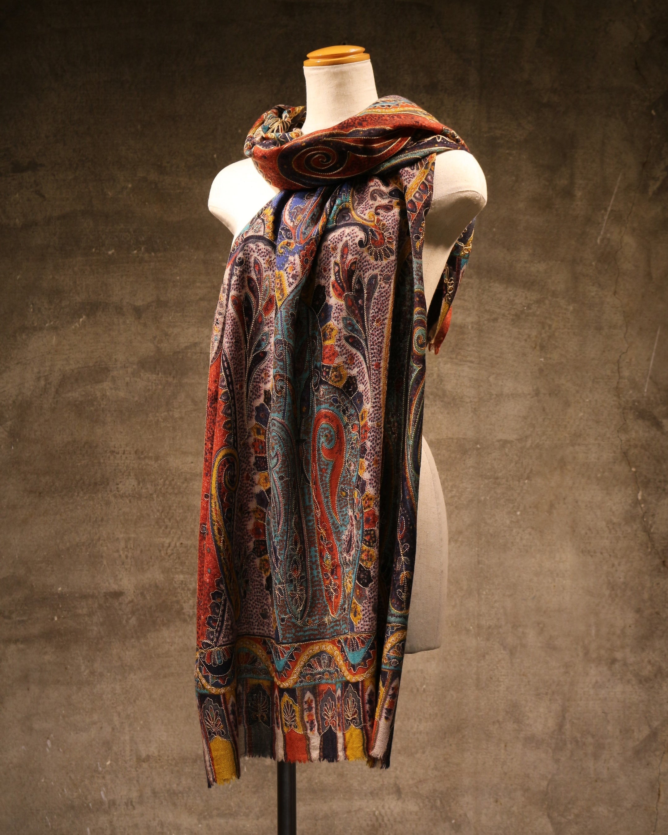 シルクとウールのいいとこ取りのストール。プリントをした柄に刺繍を施すという、緻密な作業によって作られる商品は他にはありません。