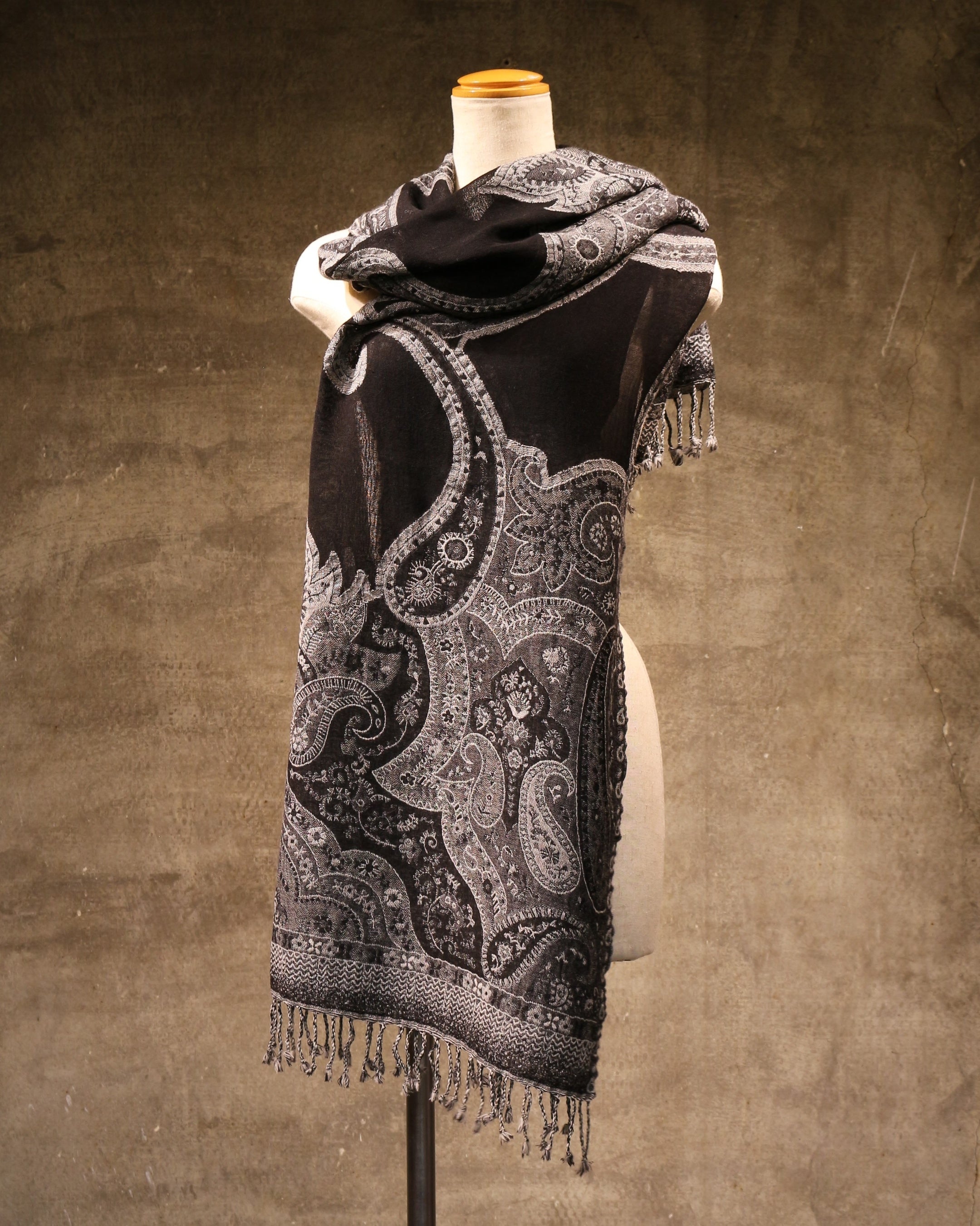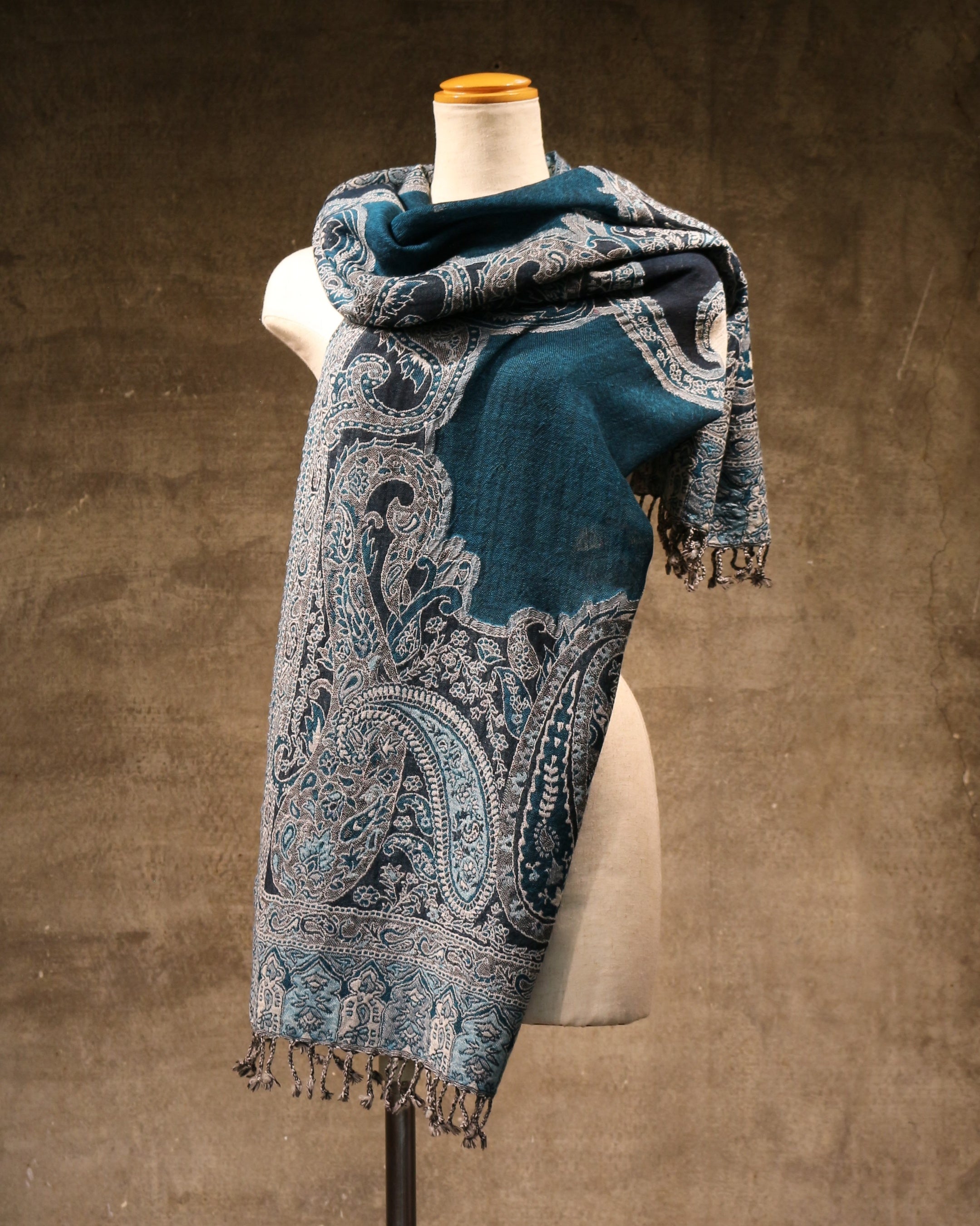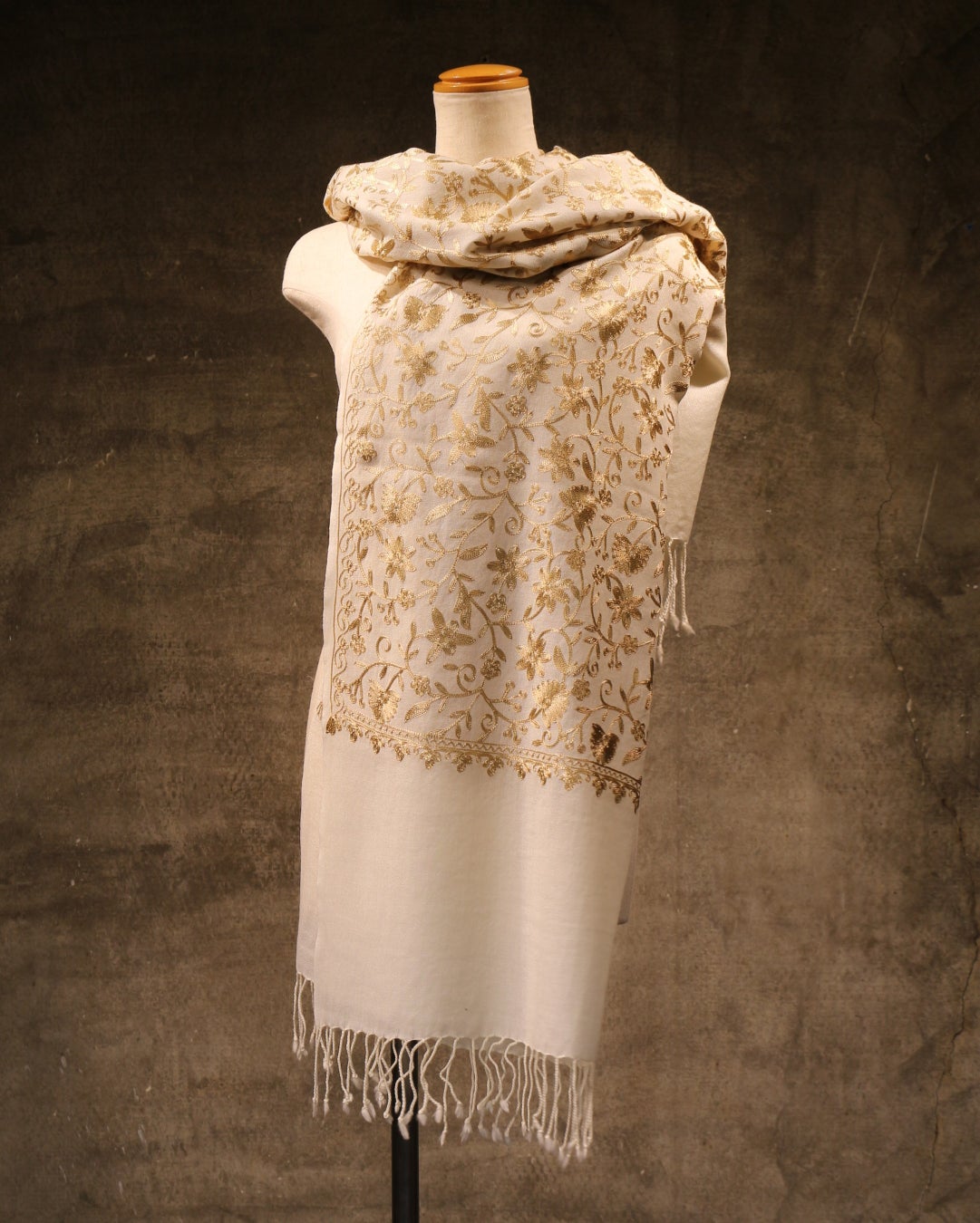 シルクとウールのいいとこ取りのストール。プリントをした柄に刺繍を施すという、緻密な作業によって作られる商品は他にはありません。