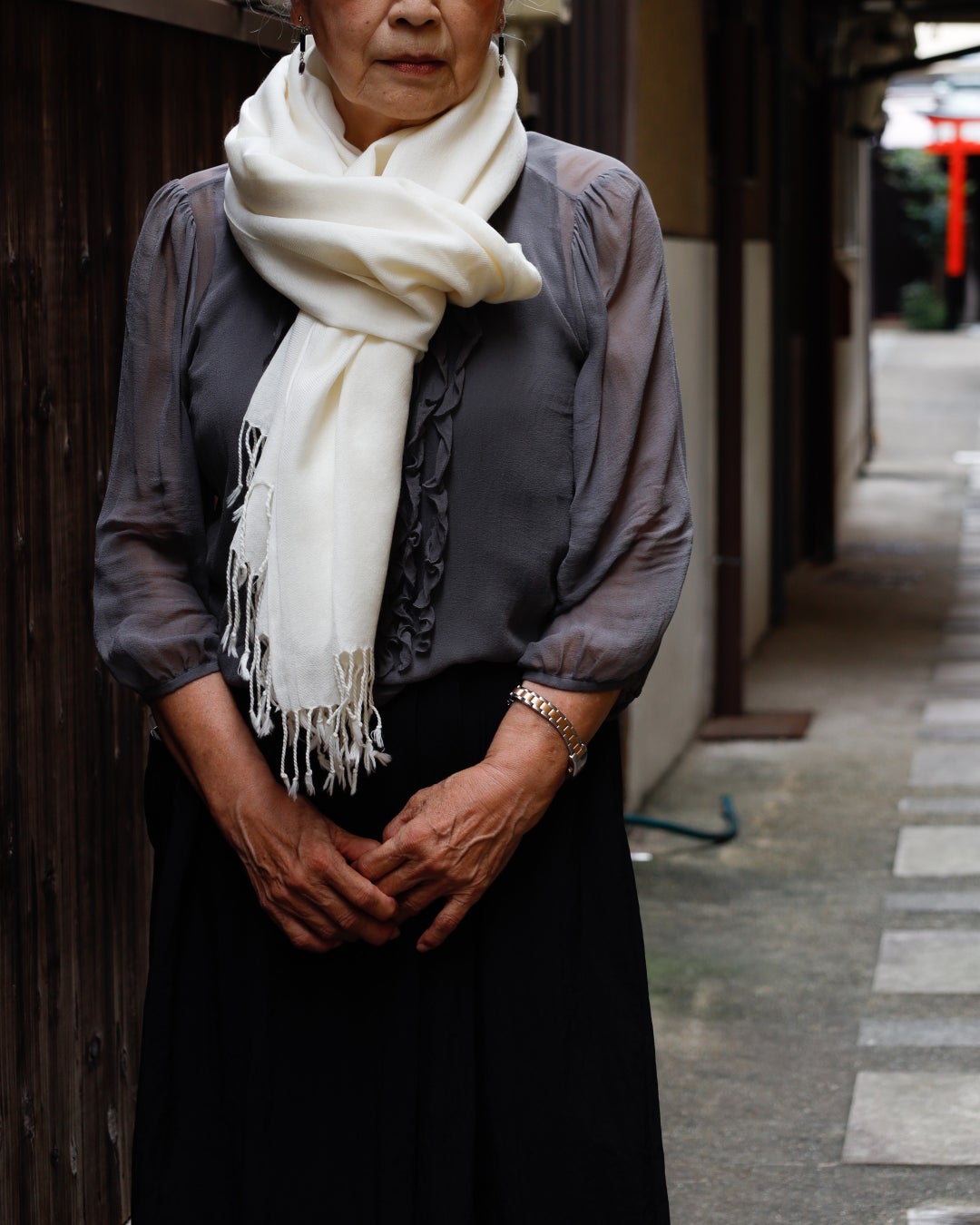 一筆一筆、職人が手書きで模様をつけています。刺繍とはちがった均一な肌触りが特徴。羽織り方折り方で、様々な印象を魅せてくれます。