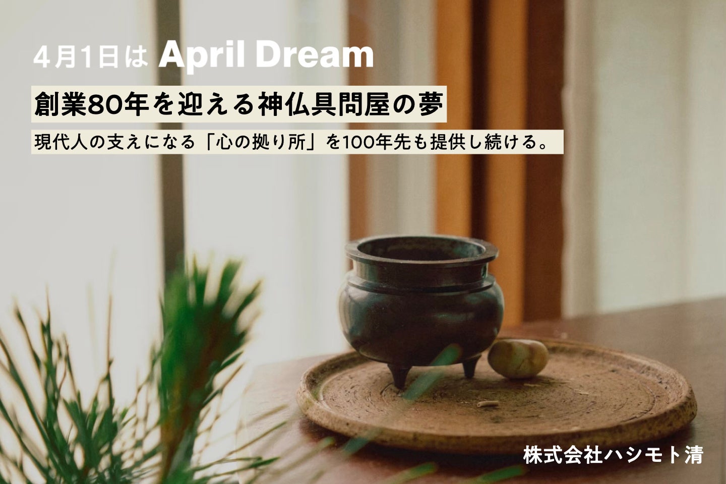1945年 富山県高岡市にて創業し、人々に心の拠り所となる商品や場を提供してきた神仏具問屋 株式会社ハシモト清(本社:富山県高岡市あわら町、代表取締役:橋本卓尚)は、4月1日を夢を発信する日にしようとするプロジェクト「April Dream」に賛同します。このプレスリリースは株式会社ハシモト清の夢であり、実現を本気で目指しています。