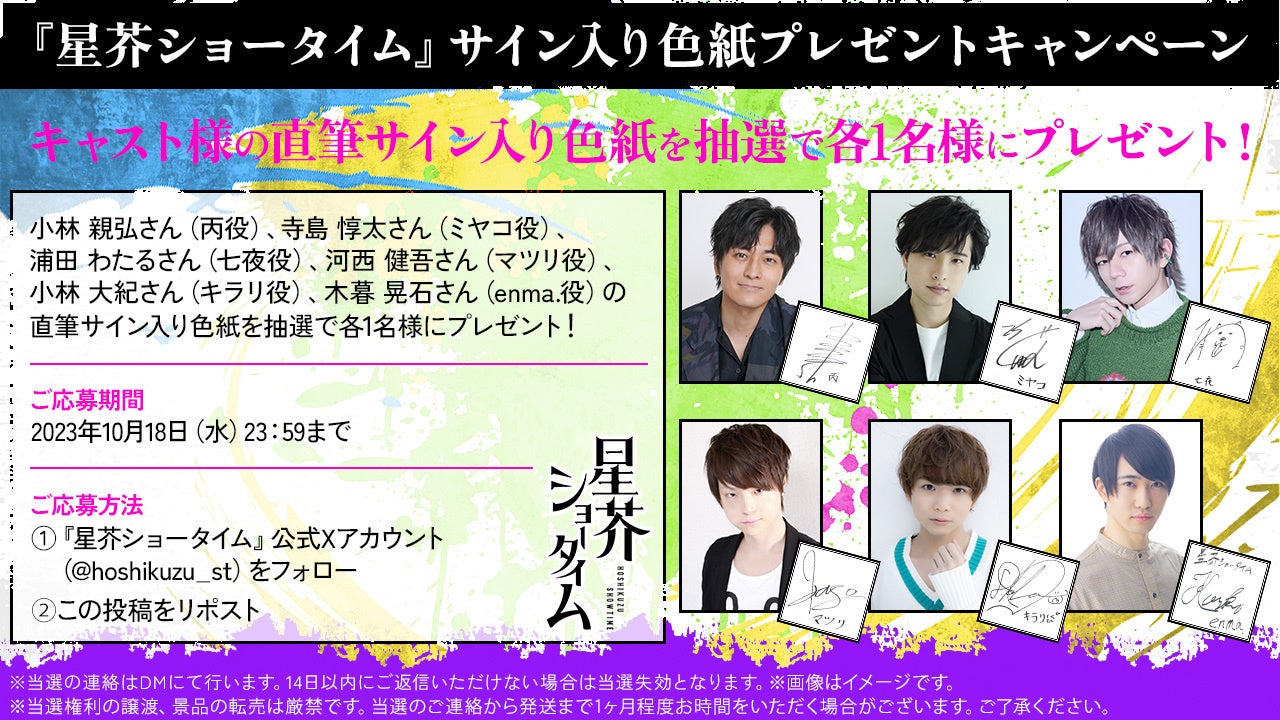 「ジンプロ」所属・新メンバー6名の発表を記念して、『星芥ショータイム』は出演声優6名の直筆サイン入り色紙が当たるキャンペーンを開催いたします。