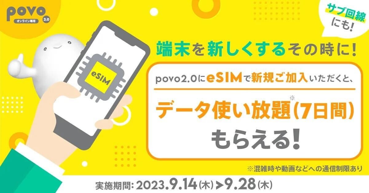 (2) eSIMでのpovo2.0新規加入で7日間データ使い放題(注)