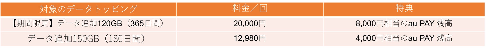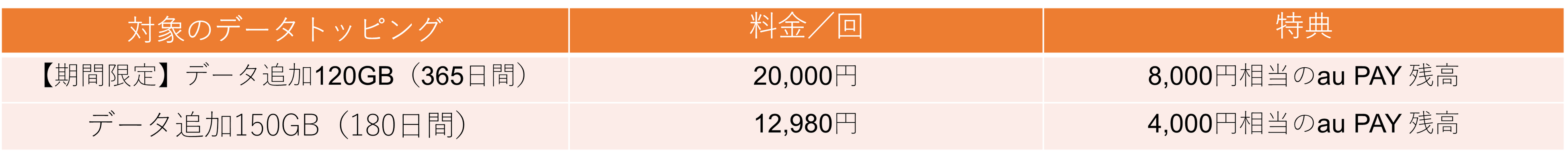 他社から乗り換え、かつ対象トッピング購入でau PAY 残高を還元します。例えば「データ追加120GB(365日間)」なら後日8,000円相当のau PAY 残高を還元するため、トッピング料金が20,000円のところ実質12,000円で利用できます。365日間のトッピングを1カ月あたりで換算すると、月々実質1,000円で10GBを利用できます。