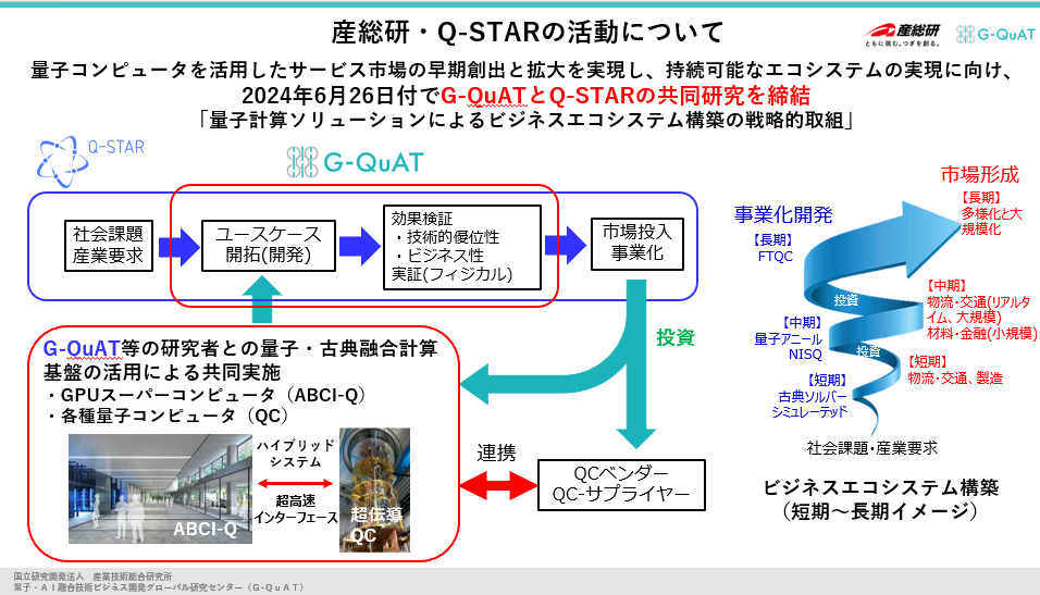 また、本シンポジウムに先立ち、Q-STARとG-QuATは量子コンピュータを活用した早期のサービス市場の創出・拡大による持続可能なエコシステムの早期実現に向け、新たに共同研究「量子計算ソリューションによるビジネスエコシステム構築の戦略的取組」を進めることを決定しました。本共同研究は、ユーザが主体となったビジネス視点でのソリューション創出・事業化により、利益の開発への再投資を促進するものです。Q-STARが持つユーザ企業・ベンダー企業による量子技術の発展と、将来の社会実装に向けた知見・ノウハウ、G-QuATが持つ多様な研究領域や国内外の研究機関とのネットワーク、さらには現在整備を進めているGPUスーパーコンピュータ(ABCI-Q)や各種量子コンピュータ等を活用して共同研究を推進していきます。