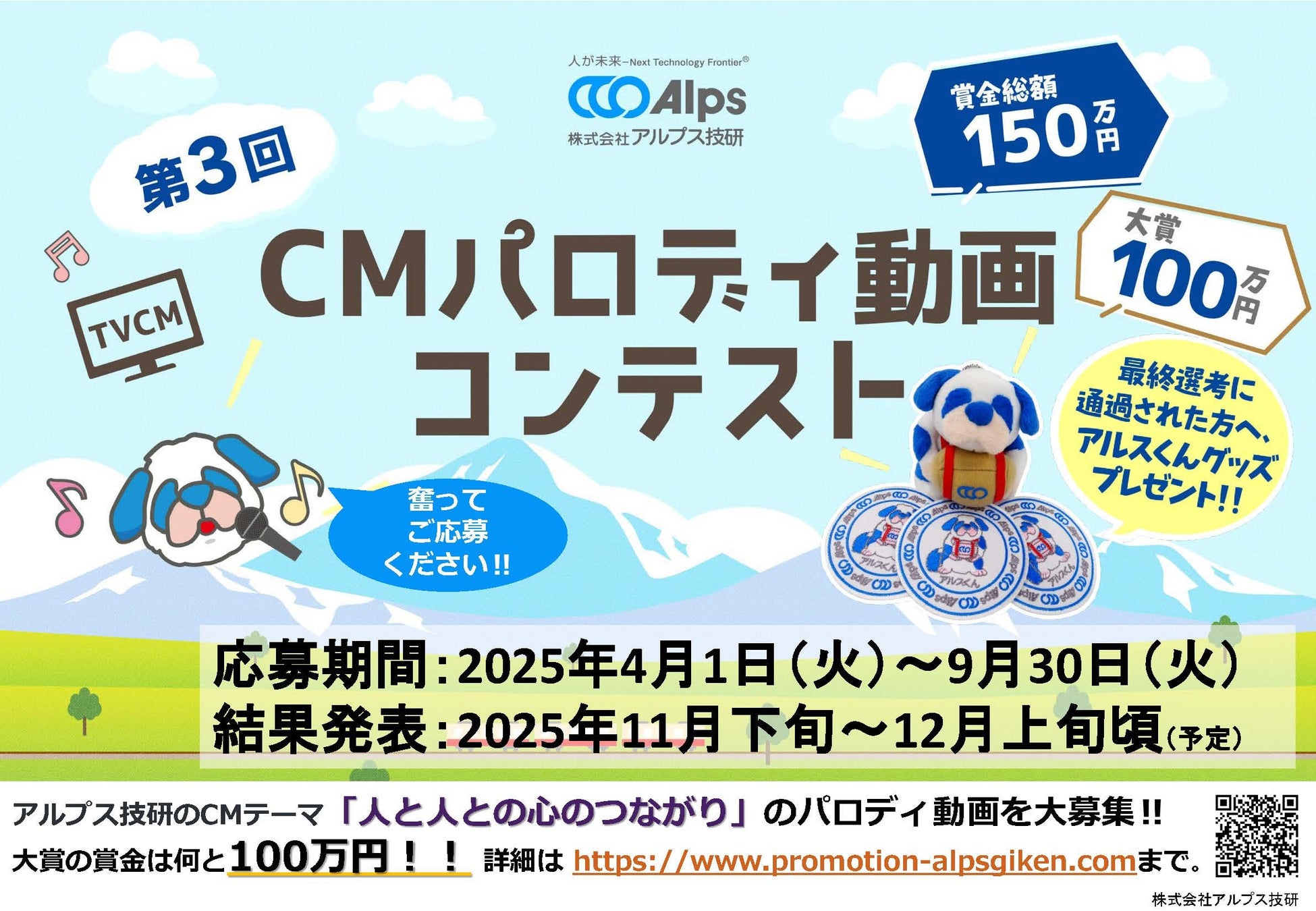 株式会社アルプス技研(神奈川県横浜市)は、「第3回 CMパロディ動画コンテスト」を2025年4月1日(火)より開催いたします。大賞の賞金は100万円です。奮ってご応募ください!!