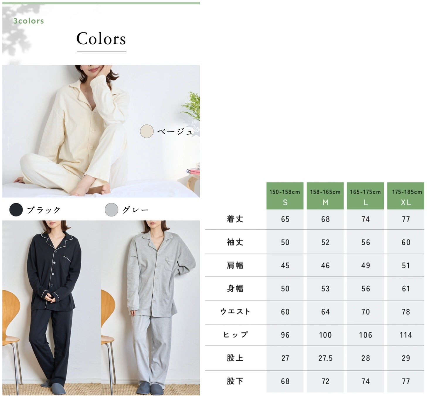 今回取り扱うアルガンソフト・パジャマは、アルガンオイルを配合した生地で作られた、肌にやさしい睡眠をサポートするパジャマです。開きすぎない襟元や締め付けの少ないウエストデザイン、そしてゆったりとしたシルエットが特徴。3色4サイズ展開で、男女共にご使用いただける一着をお楽しみください。
