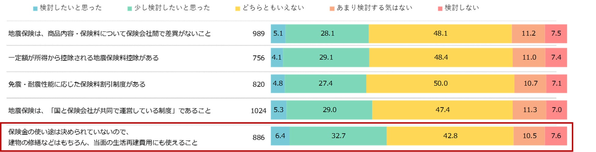 また、保険金の使用用途は決められていないことを「知らなかった」と回答した非加入者に対し、その事実を知った上で加入を検討したいと思ったかどうかを尋ねたところ、39.1%の方が「検討したいと思った」と回答する結果となり、他の項目と比較して最も高い結果となりました。