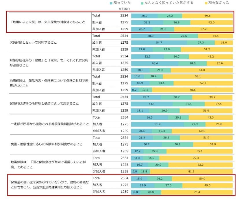 なお、地震保険に関する設問では、「地震による火災は、火災保険の対象外であること」は49.8%が知らなかったと回答(非加入者では57.7%)しました。