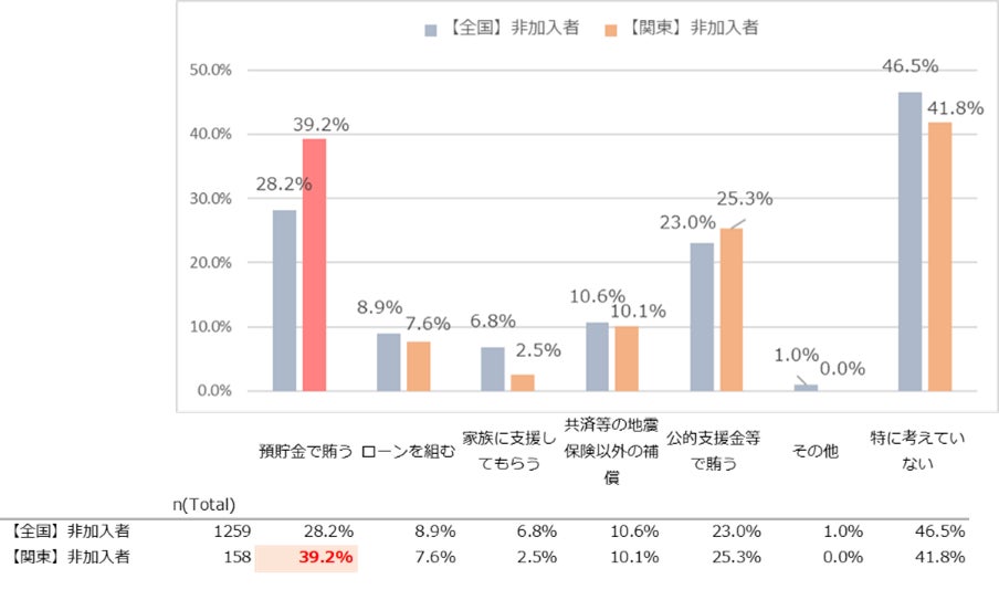 地震保険非加入者に対して、被災した際の対応について尋ねたところ、「特に考えていない」という回答が全国平均で46.5%と最も高く、次いで「預貯金で賄う」が28.2%という結果になりました。