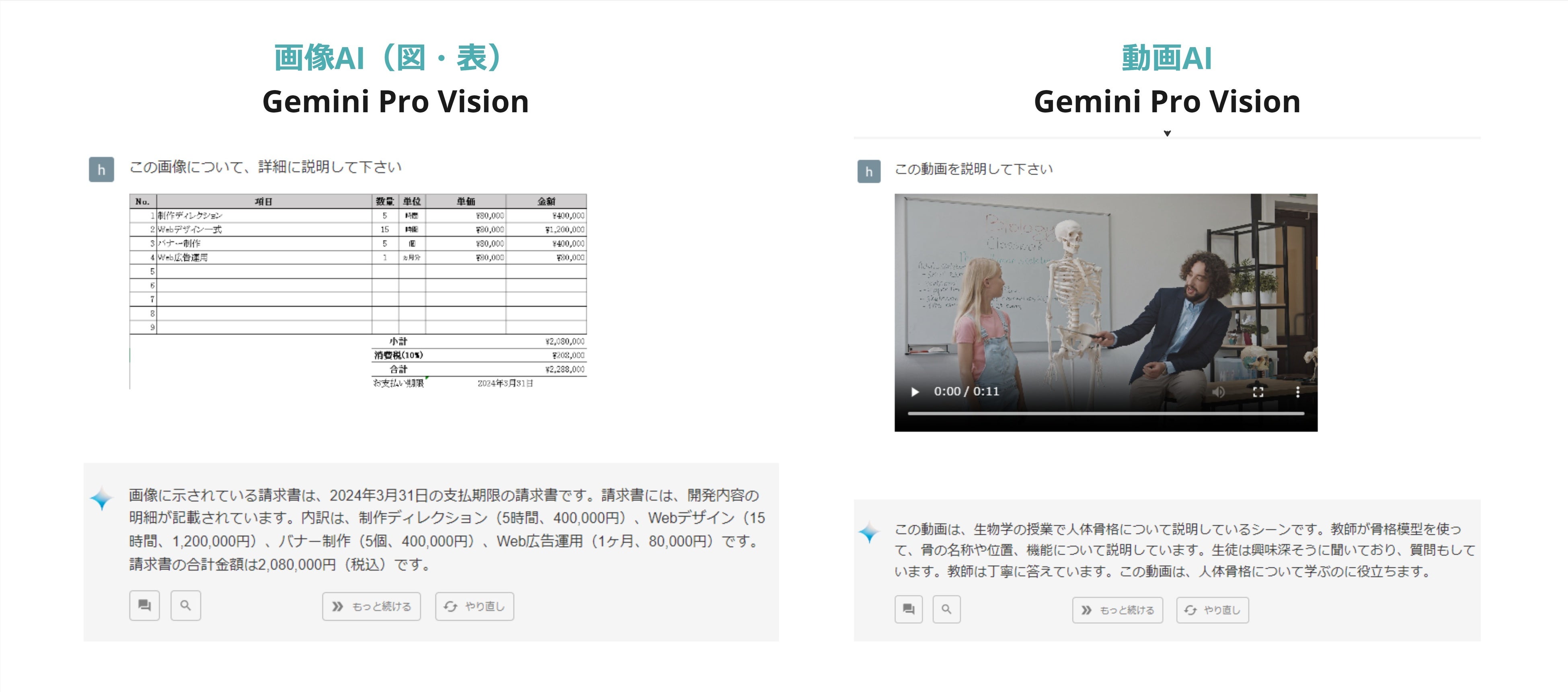先日リリースされたばかりのマルチモーダル生成AIのGeminiを活用して、画像 (写真・図・表)、動画にも対応しており、ChatGPTやGeminiなどのAIチャットサービスと同じようにチャット内で利用可能となっています。