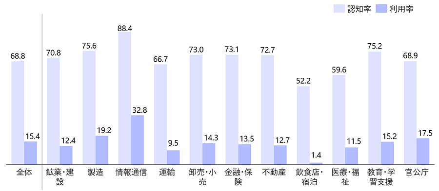 株式会社野村総合研究所が発表した2023年6月時点での業種別に見たChatGPT認知率・利用率のデータでは、認知率に対して利用率が圧倒的に下回っており、全体として認知率68.8%に対して利用率15.4%という低い結果となりました。