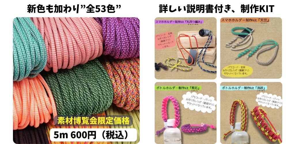 新発売のパラコードを使った丈夫な靴ひも【パラコード・シューレース】、他にもオシャレな作品が簡単に作れる説明書付きのキット、数量限定のお買得品、日本製のくすみカラーのコードロックなど、普段は手に入らない魅力的な商品が展示・販売されます。