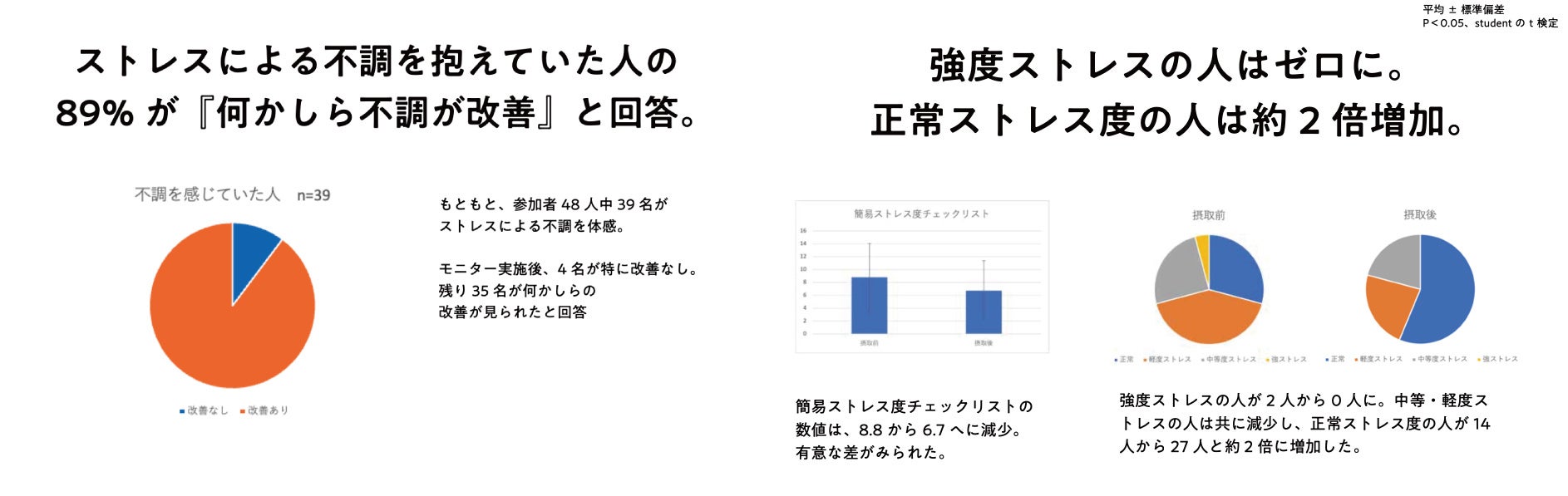 ストレスによっておこる不調が改善され、特に朝すっきり起きられるようになった、疲れが取れやすくなったという結果がみられました。全体的に、一定のストレスに対する適応力が向上し、ストレス耐久性が高まった可能性がある。