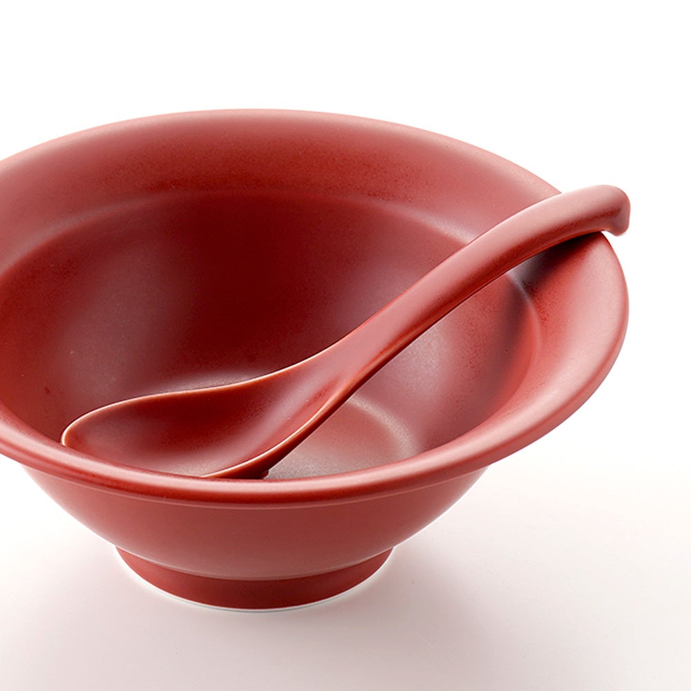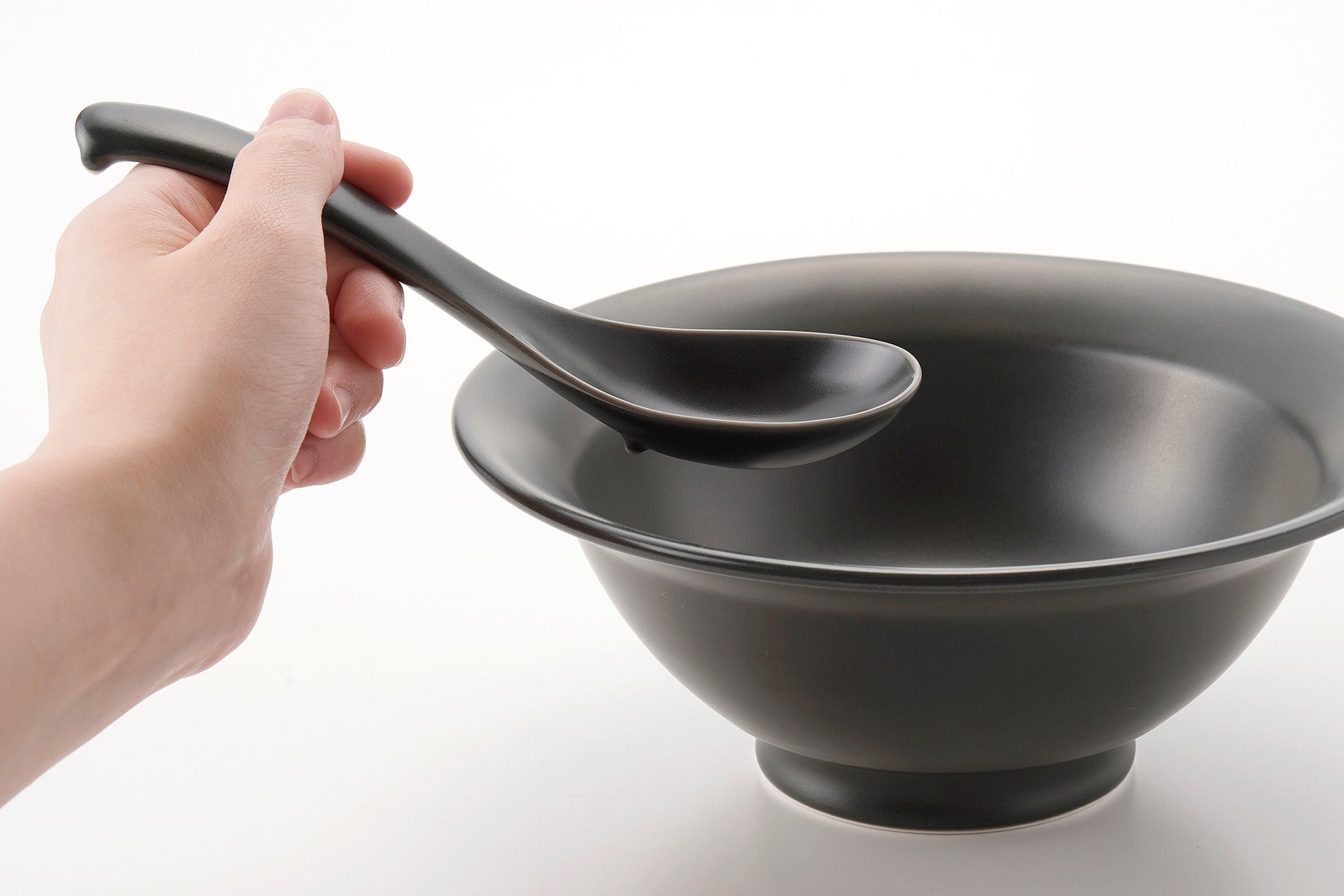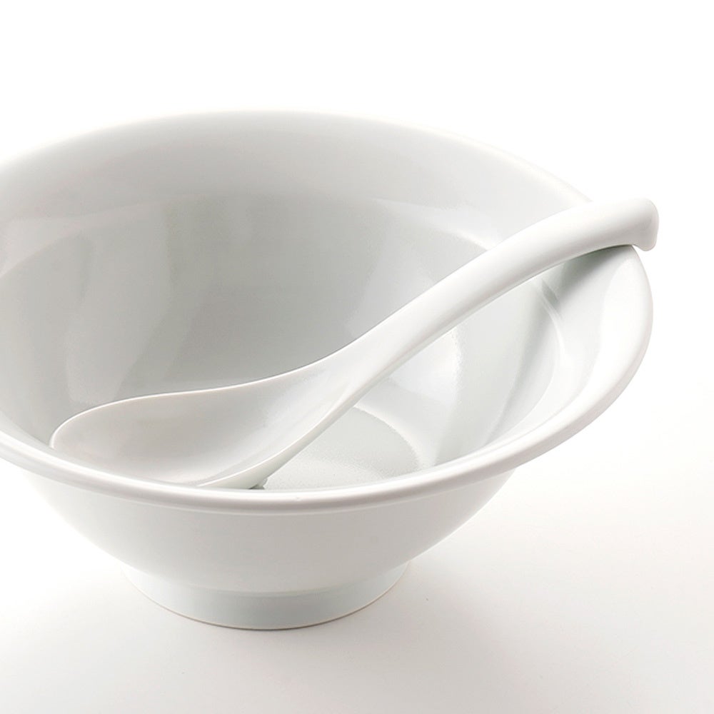 スープが飲みやすく、持ちやすい角度にこだわった設計。すくう部分はやや大きめで麺や具材も載せやすく、縁先は口当たりの良い薄いつくりに。