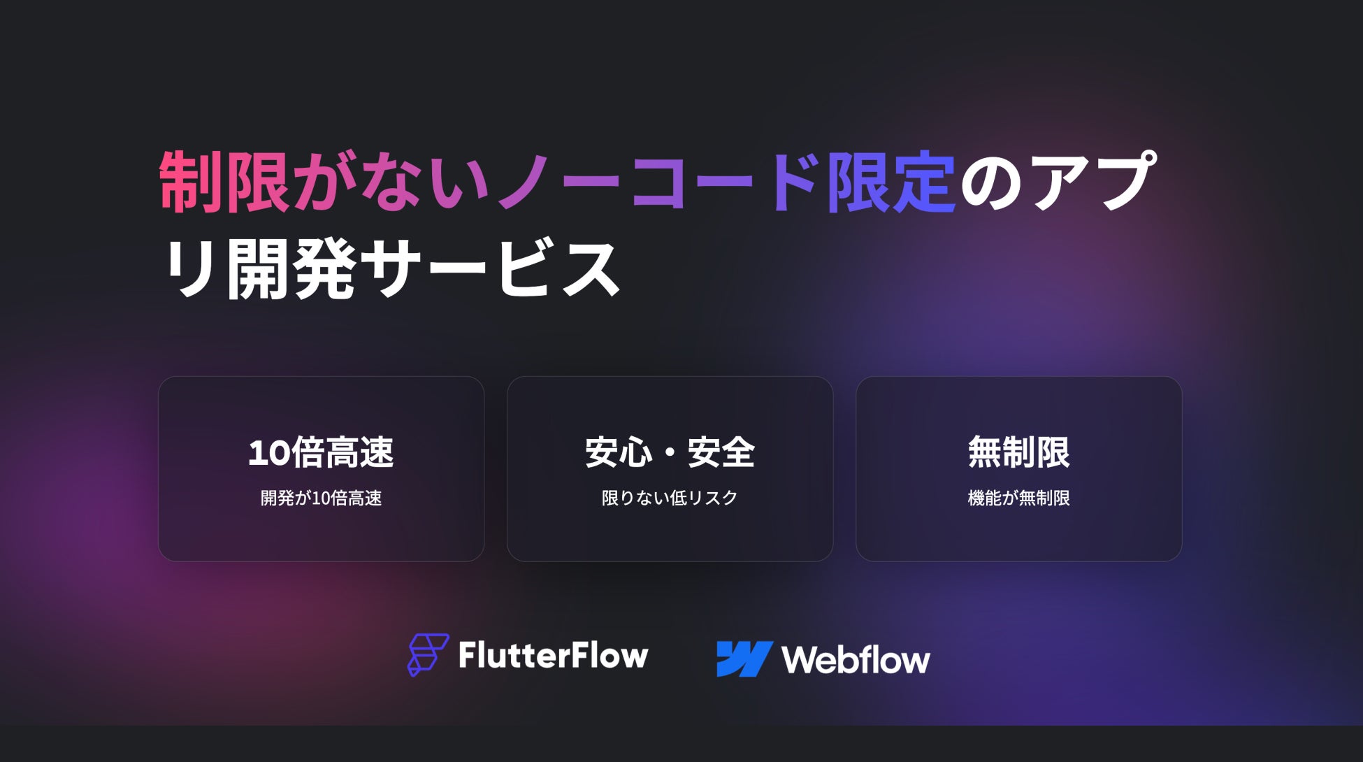 NoCode Infinityは主にFlutterFlowとWebflowというコード出力可能な次世代のノーコードツールを採用し、開発を行います。