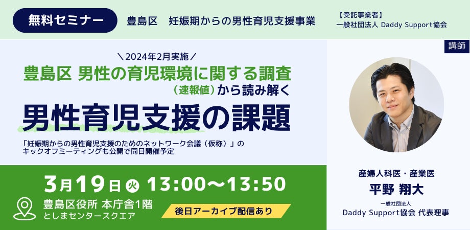 豊島区は2024年3月19日(火)に、豊島区役所1階としまセンタースクエアにて、男性育児支援に関するセミナーおよびキックオフミーティングを開催します。