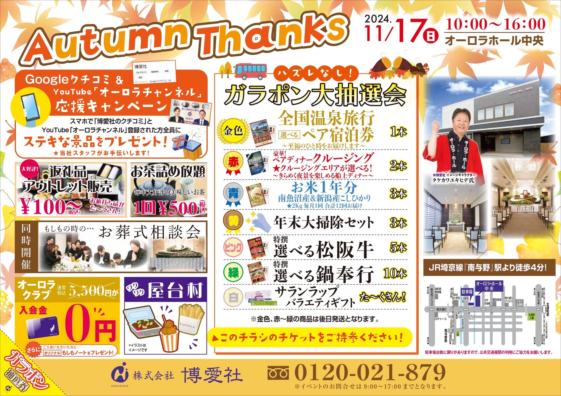 (株)博愛社の直営式場オーロラ・ホール中央(埼玉県さいたま市中央区新中里2-2-9)にて豪華開催!!当日は様々な催し物あり↓↓詳細は下記にて↓↓
