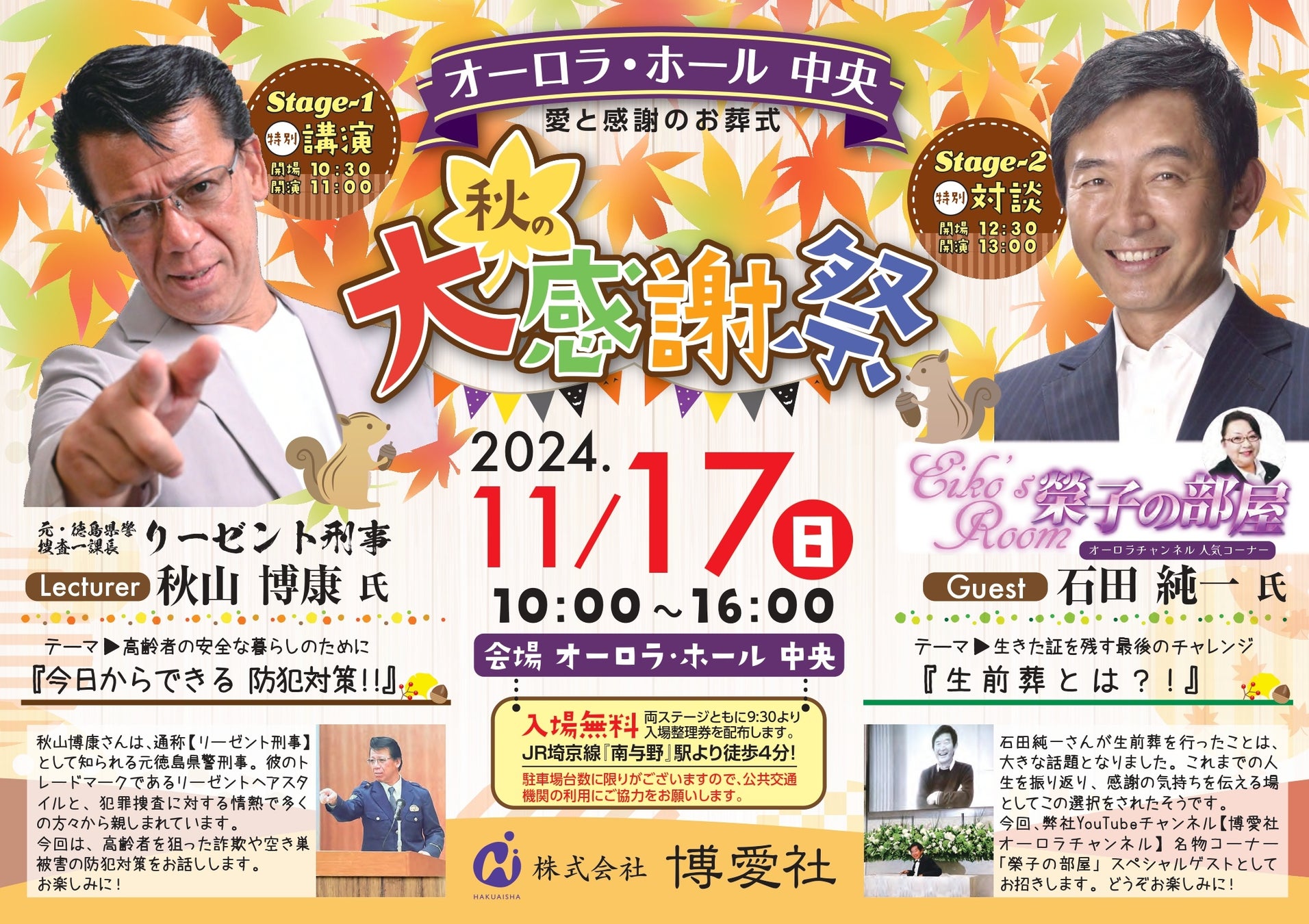 さいたま市の(株)博愛社(オーロラ・ホール)が「秋の大感謝祭」を開催。あの元祖トレンディ俳優「石田純一」氏とリーゼント刑事の愛称で親しまれている元捜査一課「秋山博康」氏を豪華お迎えし、講演・対談決定