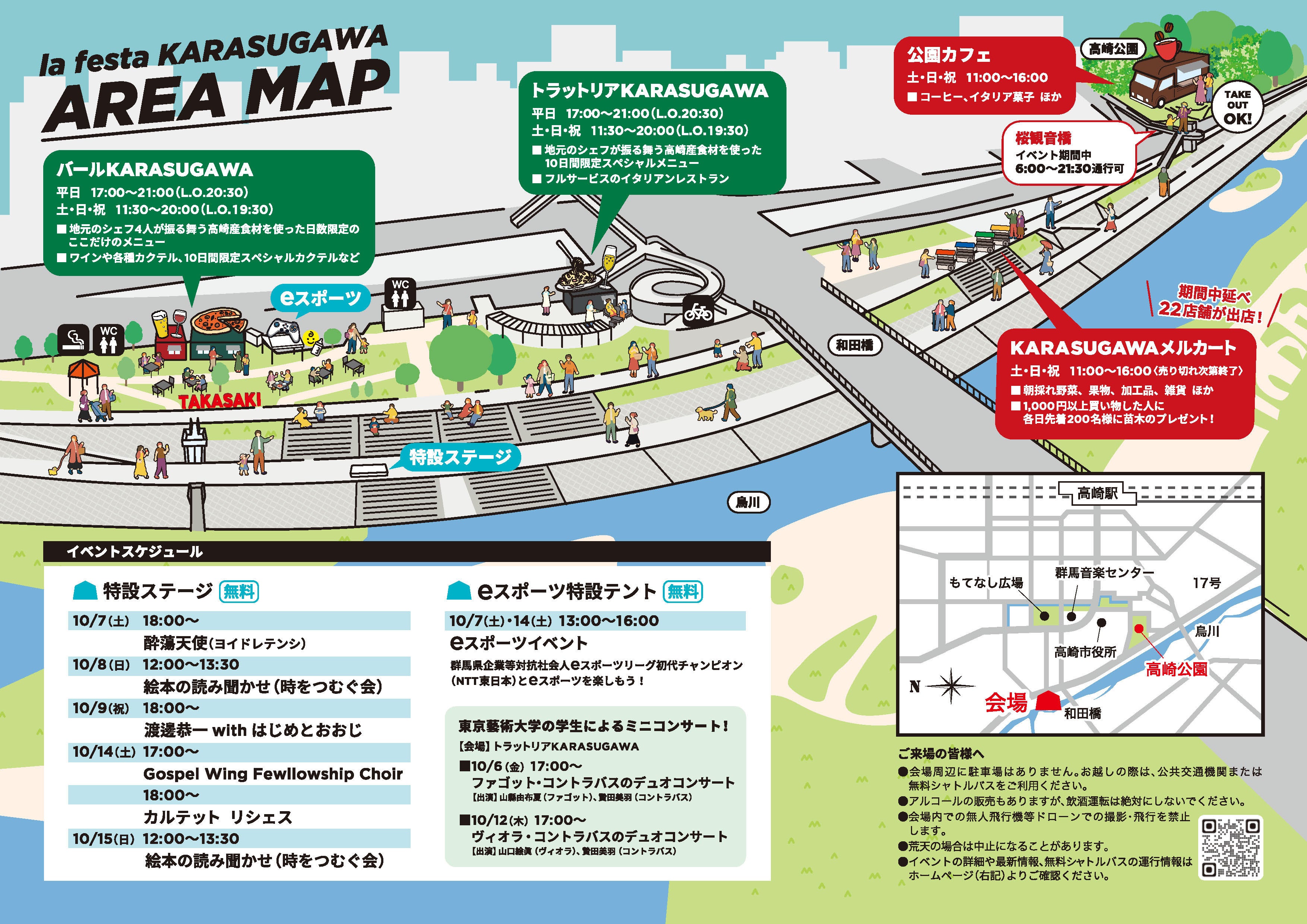 高崎市と高崎観光協会は、高崎市の中心市街地近くを流れる烏川のほとりで、食と音楽を楽しむイベント「la festa KARASUGAWA(ラ フェスタ カラスガワ」を開催します。