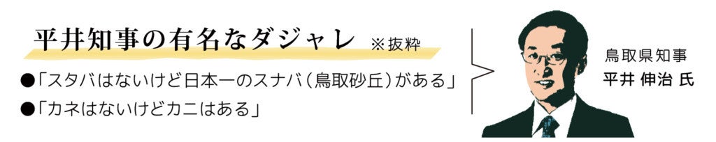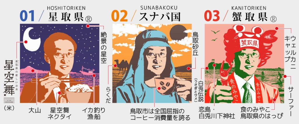 平井知事のダジャレをもとに、鳥取県が展開するPRキャンペーン(星取県/スナバ国/蟹取県)をテーマに、3つのイラストを制作。鳥取県庁の各部署にご協力いただき、鳥取を象徴する風景や特産品などを入れ細部までこだわりました。メディアに登場した知事の衣装や小道具も再現しています。