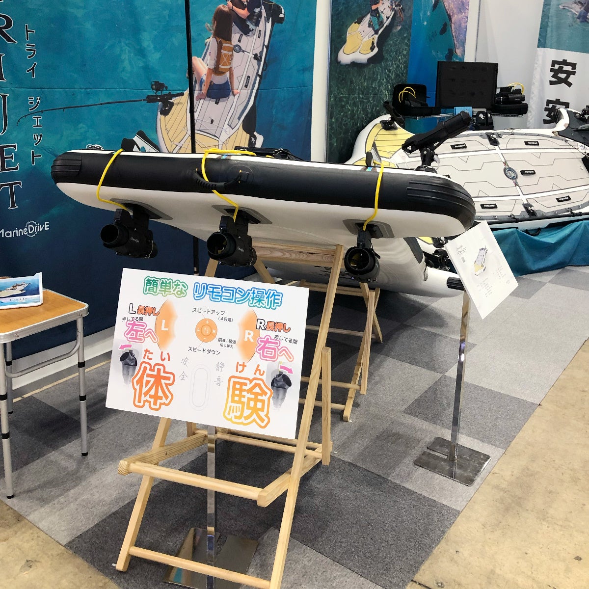 弊社マリンドライブのブースでは、2台の電動トライジェットを展示します。このジェットのユニークな特徴の一つは、リモコンによるターン機能を搭載している点です。このターン操作について、実際製品に触れて、仕組みをご理解いただけるよう、操作体験コーナーを設けました。