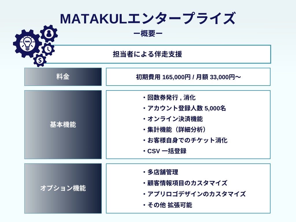 今回リリースした新プラン『MATAKUL エンタープライズ』では、小規模店舗で活用されてきた実績データをもとに担当者による伴走支援を行います。最適な利用方法やオプション機能を提案し、シンプルでありながら目的にフィットするプランを提供します。回数券の多店舗管理や、イベント、社内向けツールにもご利用いただけます。