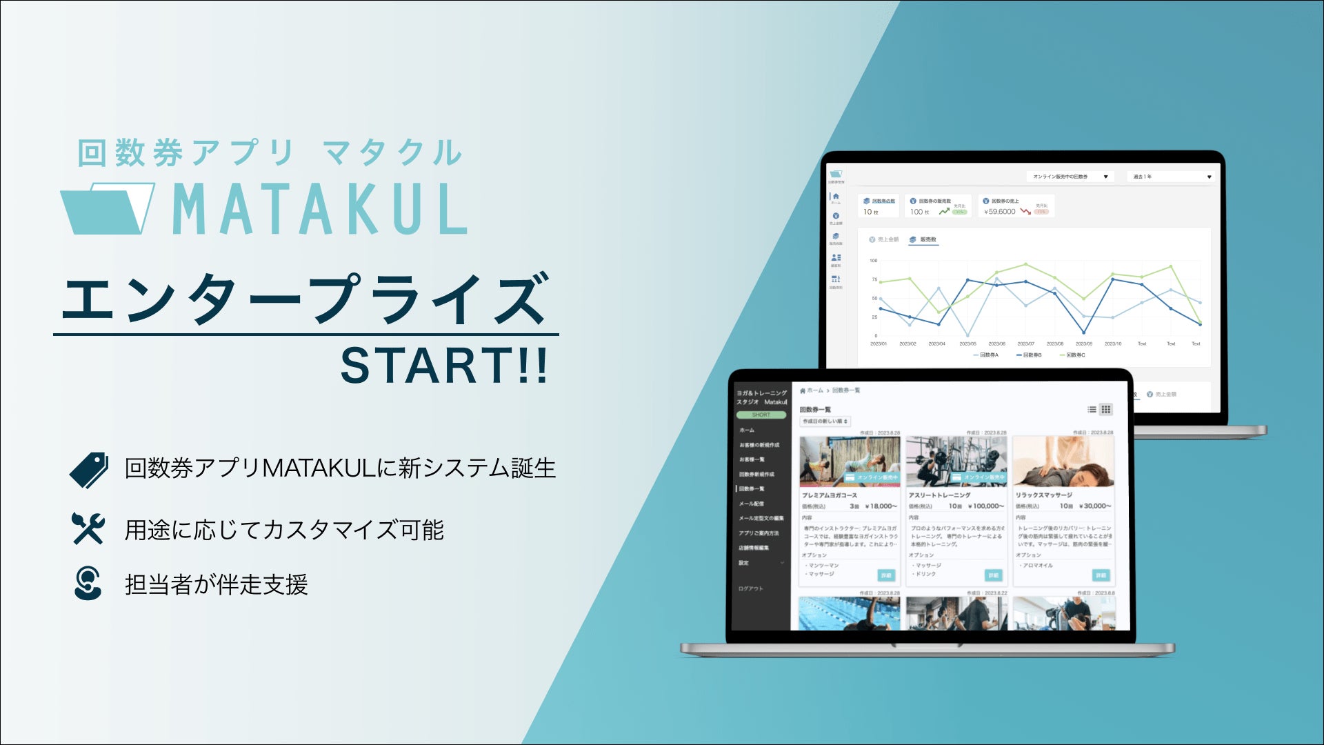 回数券アプリMATAKUL(マタクル)をアップグレードしたエンタープライズプランを新たにローンチ。MATAKULの実績データをもとに、目的に合わせたカスタマイズと伴走支援を担当者が行います。