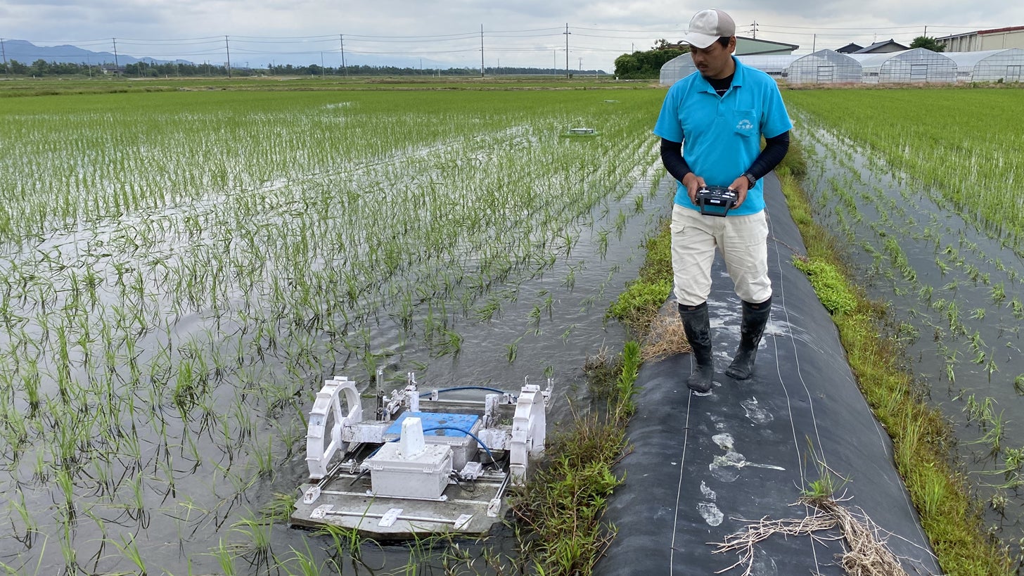 圃場に入らず初期除草/有機米の生産を省力化