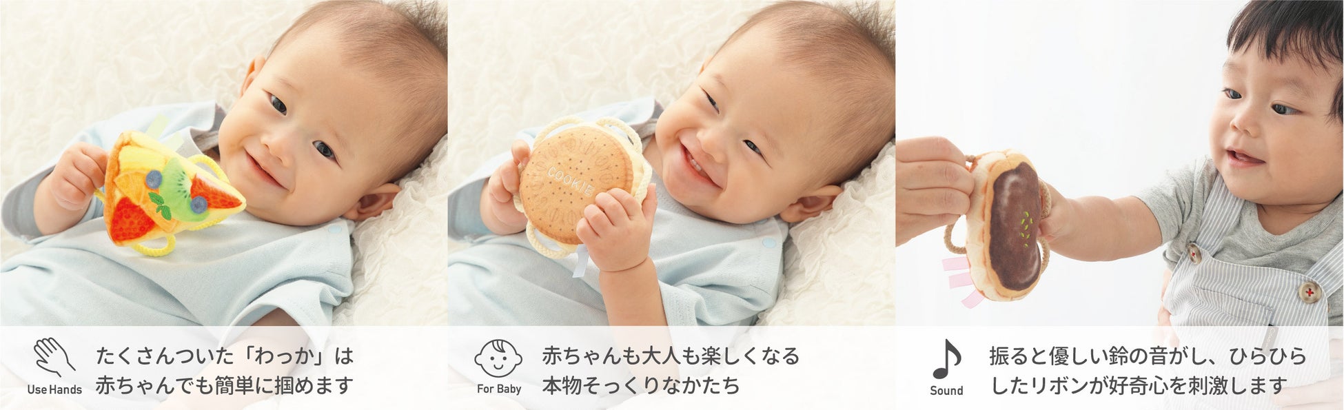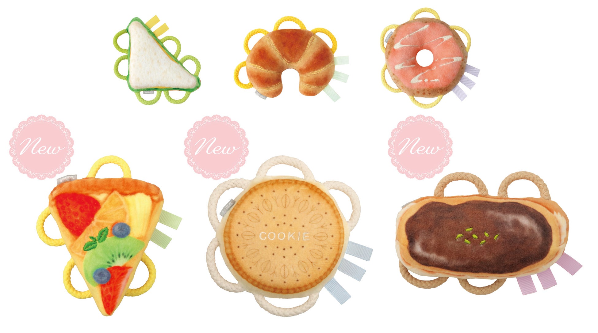 サンドイッチ・クロワッサン・ドーナツをモチーフにした本物にそっくりなデザインで全3種をリリース。発売以降、赤ちゃんが同商品で遊んでいる姿が「まるで赤ちゃんがパンを食べているみたい」「写真を撮る手が止まらない」と大好評。メディア掲載後に公式オンラインショップにて一時完売、Amazonがらがら・ラトルのほしい物ランキング2位・売れ筋ランキング3位、人気ギフトランキング2位を獲得するなど売れ筋商品となった。(2024年11月26日時点)