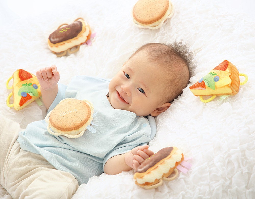 リアルを追求したスイーツデザイン。フルーツタルト、クッキーサンド、エクレアの全3種類。両面で色の違いを楽しめる仕様。少し大きくなったら「ちょうだい」「どうぞ」のやりとりや、ごっこ遊びも楽しめます。