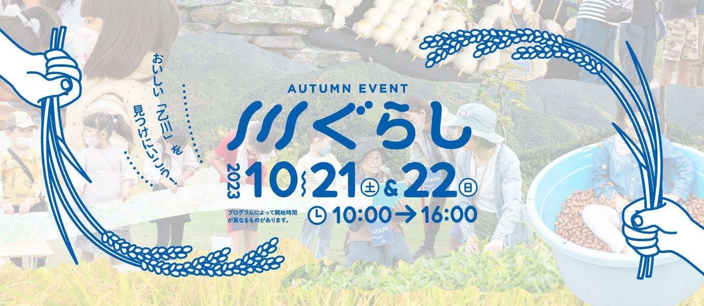 「川ぐらし」は乙川の上下流連携・流域内循環、地産地消、木のある暮らし等を市民の皆さんにお伝えしたいと思い、2019年から毎年秋に開催してきました。5年目となる今年は「おいしい乙川を見つけにいこう!」をテーマに掲げ、乙川流域の資源を活かしたおいしい食べ物の提供や体験を実施します。