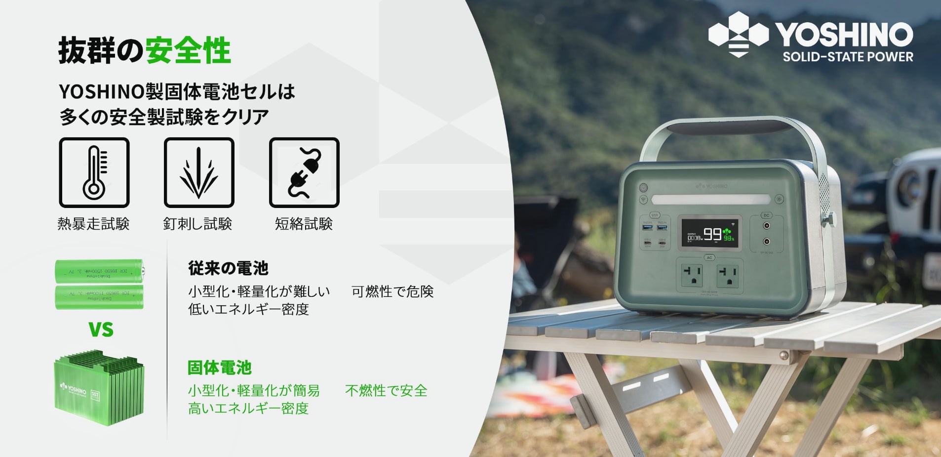 YOSHINOのポータブル電源は固体電池を使用しているため従来では考えられない安全性能を誇ります。